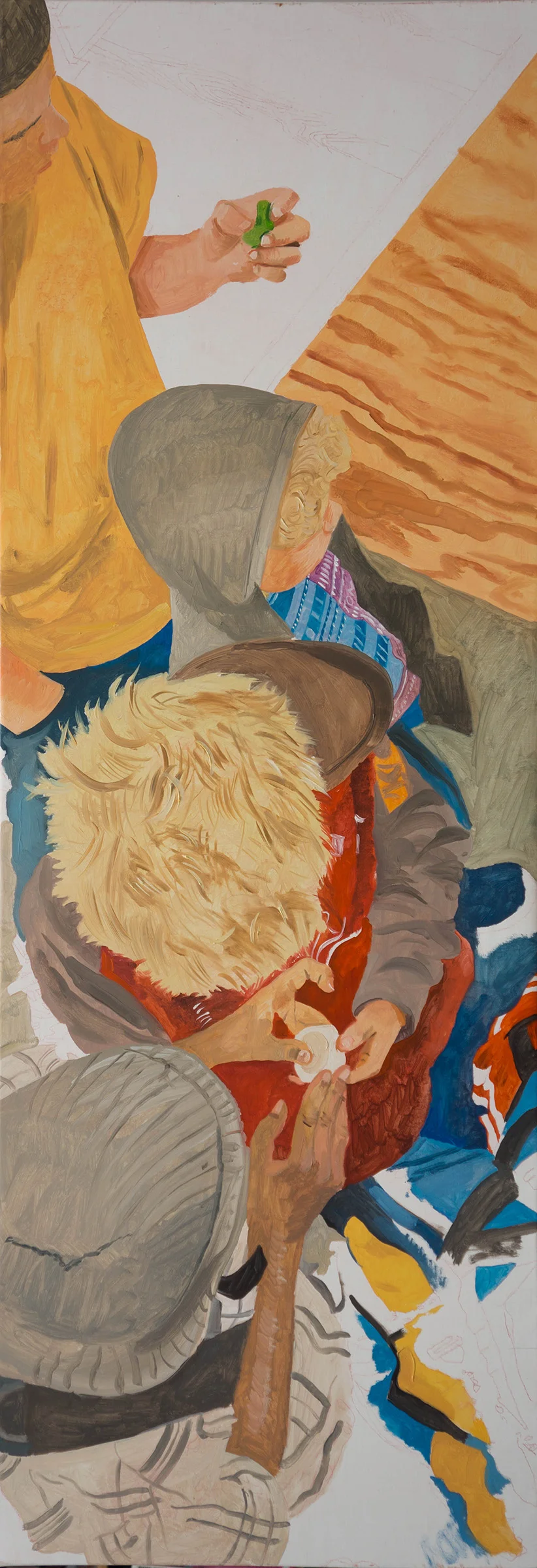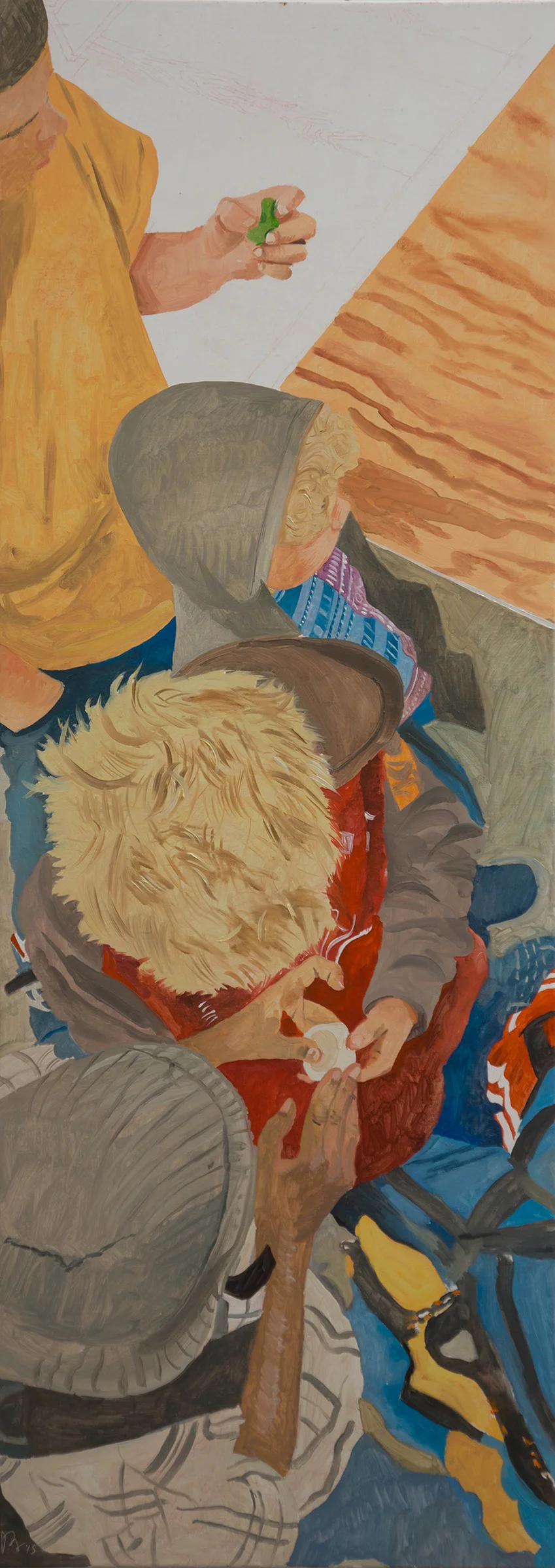 the coloristic gamut is, i would say, characteristically tarlovian; rooted as it is in earth tones. there are enough neutral greys to allow the blues, reds and yellows to pop. and the biomorphic shapes, some of which announce "hair," others "hand," are a perfect foil for the pattern of the wood or the wool cap. the application of oil paint is certain, playful and extremely sensual.