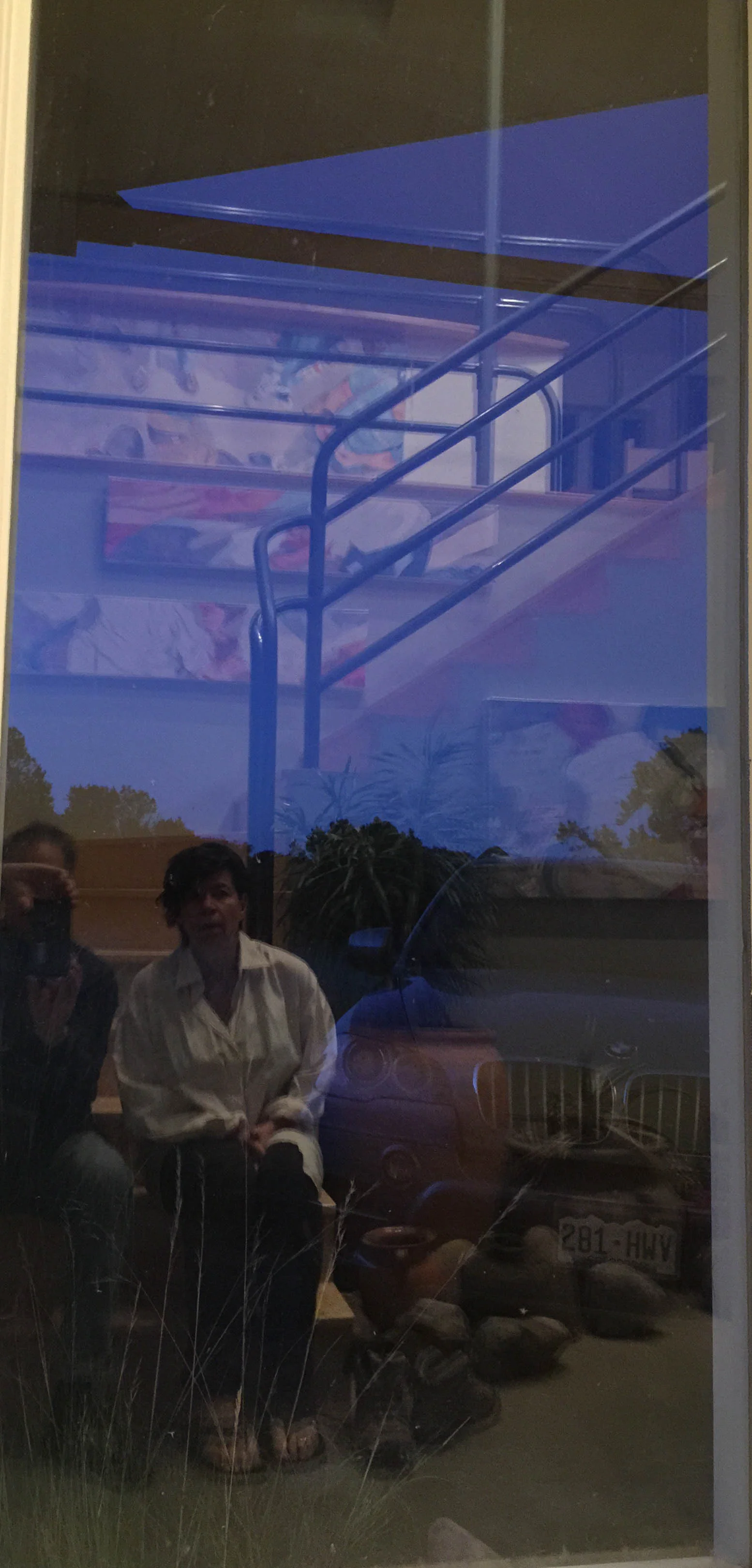 as we sat on the staircase this morning putting on our hiking boots i shot these photos of a reflection in our north facing window. behind us, some of the parade series paintings hanging on our walls, soon to be shipped to houston.