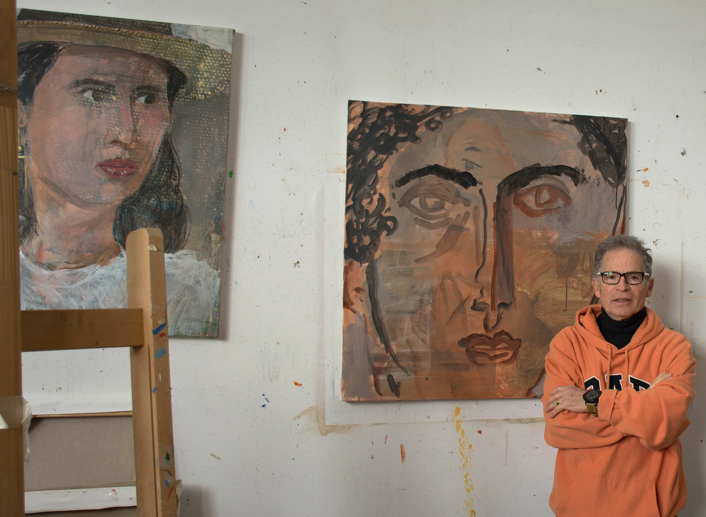 2:23 PM: i did some tweaks to gaze 33, which is a portrait based on a 1992 photo of mikela in a hat, and i think they made a big difference, and that the painting seems resolved now. on the left below, the previous version, right: after today's tweaks. areas i worked on that you can compare: left brim of the hat, which was extended upwards; whites of her eye, where a slight accent was applied; white accents on the t-shirt; modification of the area above her right eye, so that the dots are less prominent; slight breaking up of the area of grey to our right of her face; subtle highlight on the tip of her nose and a few highlights on the gold color of her earring.