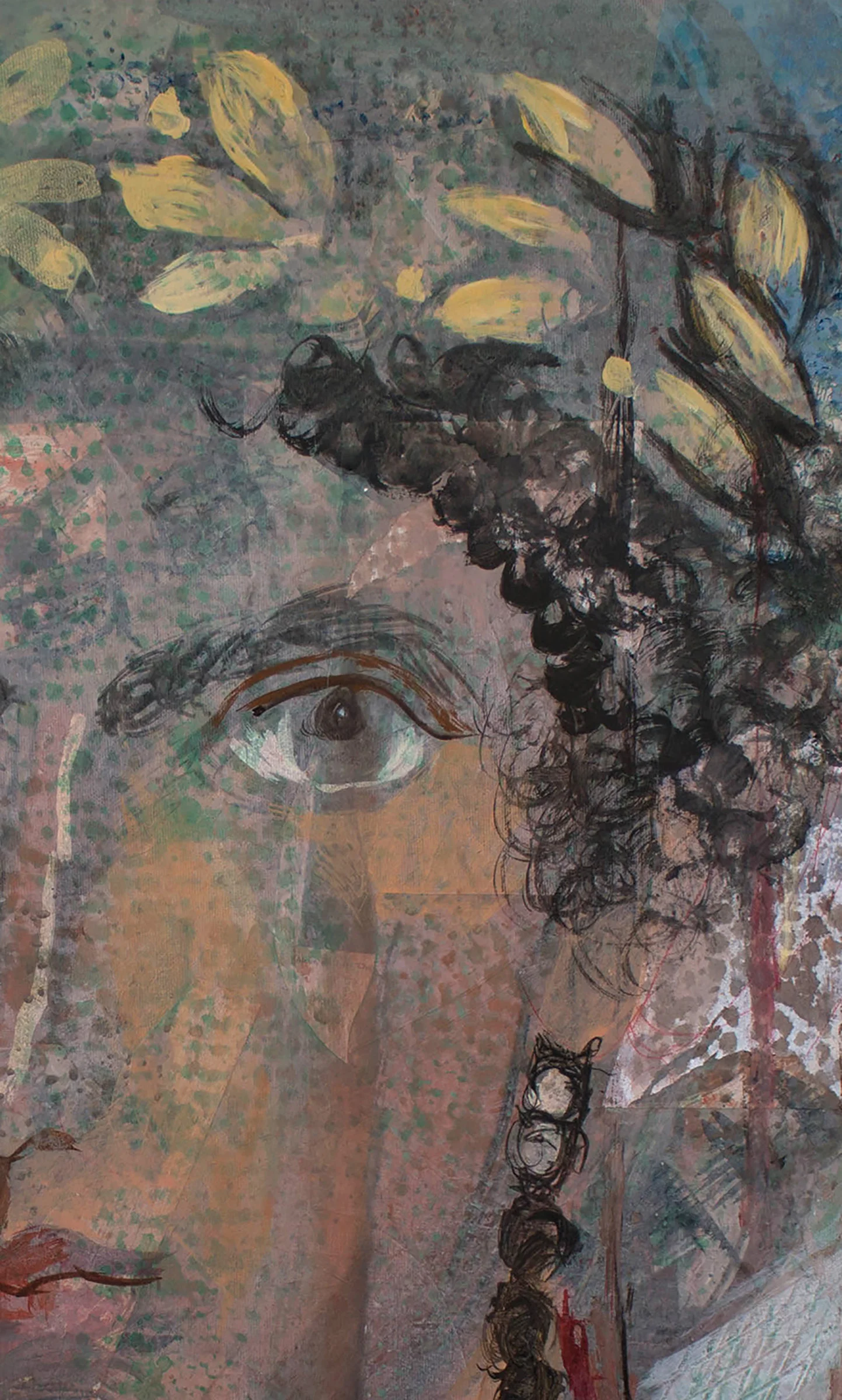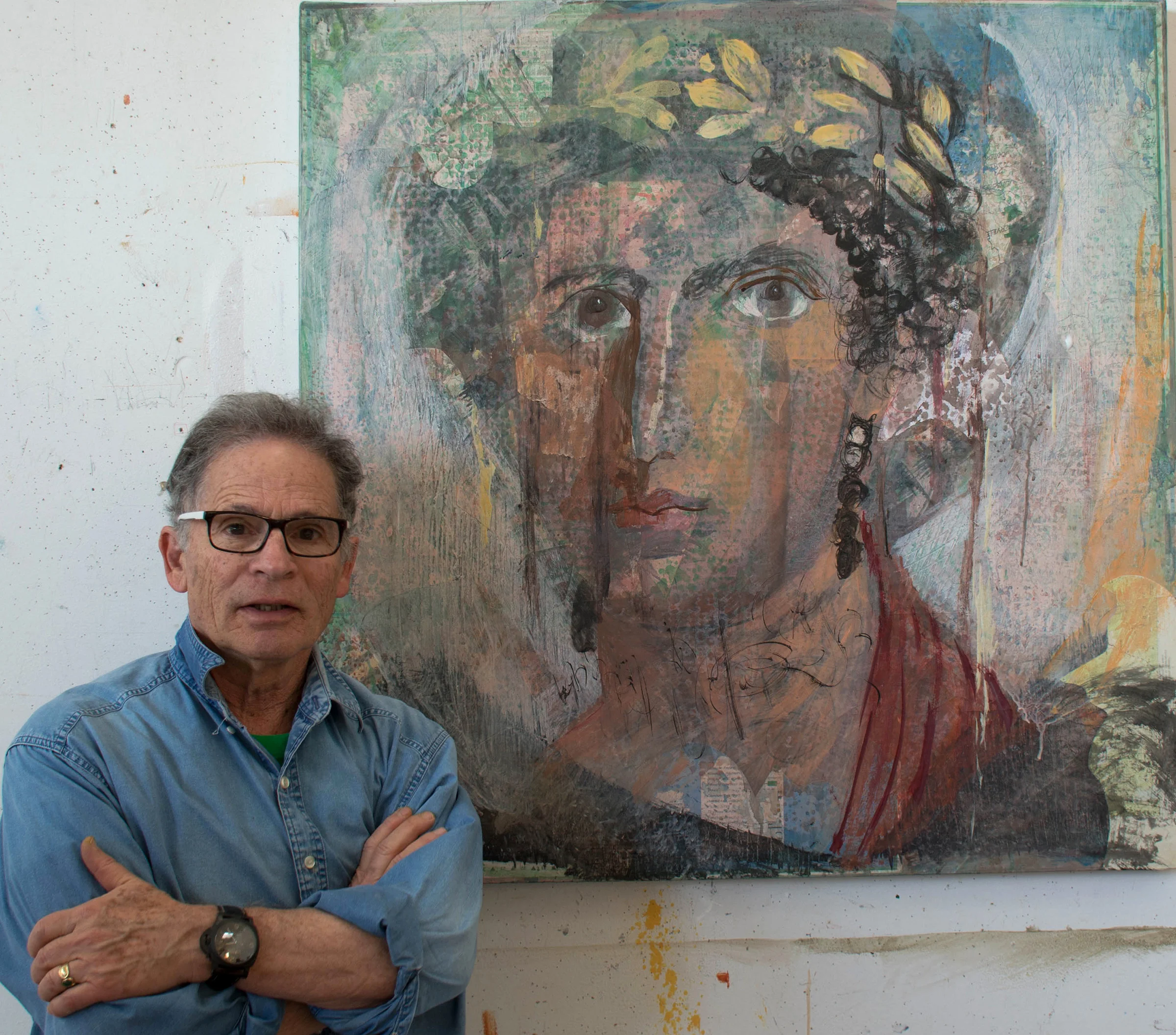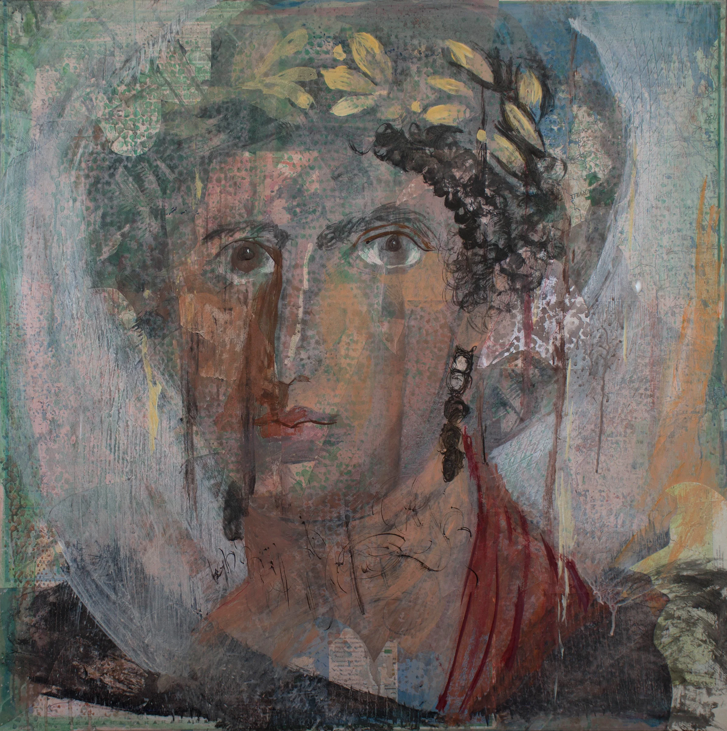 i launched into setting out my colors and painting faster than usual, and had a very productive 2 hour session. gaze 34 is skating the edge of verisimilitude. by that i mean the degree to which it's true to the source: a 1st c. fayum portrait of a woman with a golden crown of leaves. by the edge, i mean that tendency i speak of so often to want to make what i'm painting look like whatever it is i'm looking at, as much as possible. usually, this is to the detriment of the picture plane. when that happens, i scrumble and paint over what i've done, using the traces of that under-painting to enrich the next layer. that process continues until the picture plane triumphs.