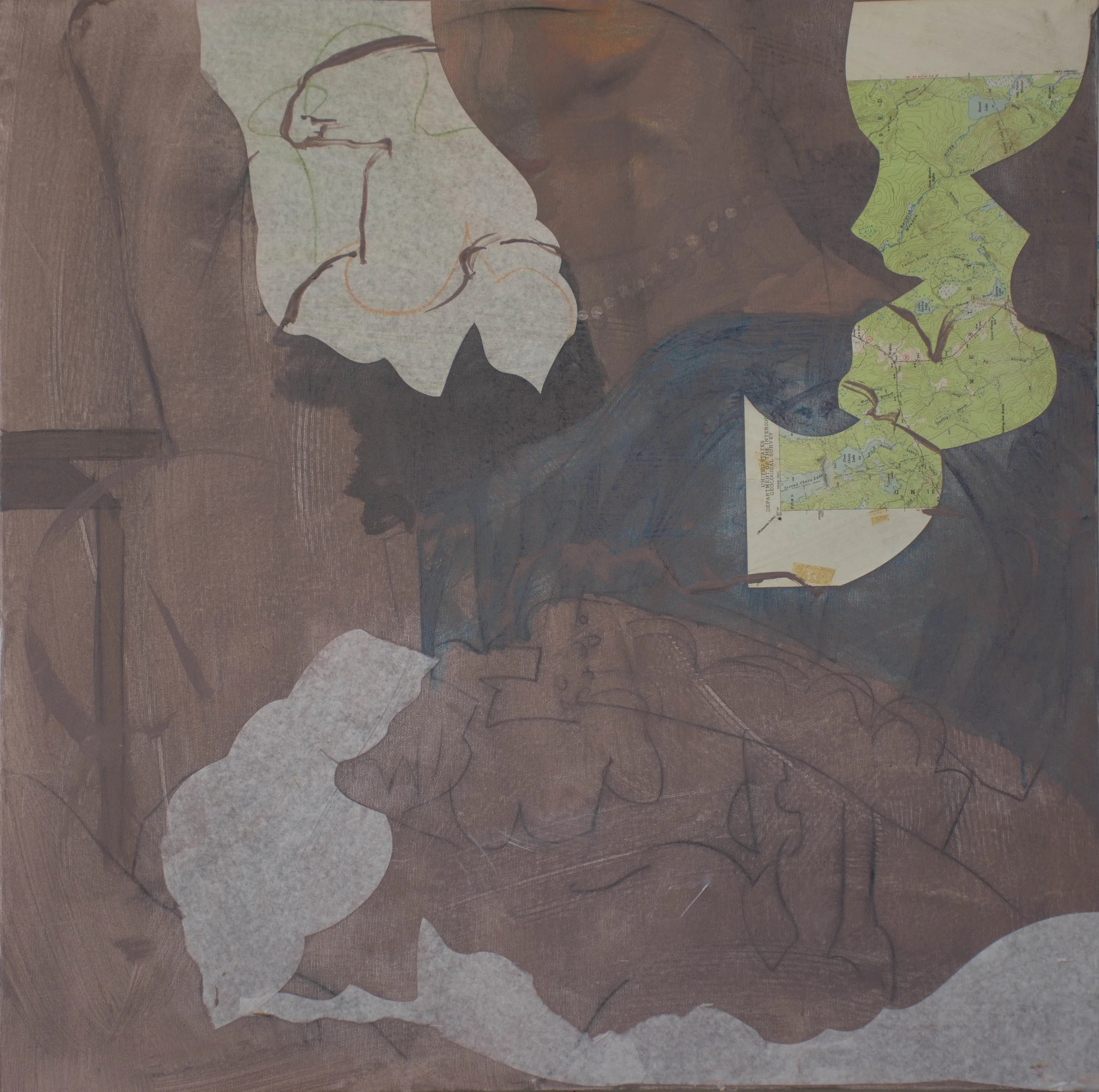 2:28 PM: well, i did do a bit of work on my first day back in the studio. predictably (oh how i hate predictability) i obliterated the previous image. the entire surface was washed over with a very light mauve-ish color, and then collage was applied in 3 areas, one of which was cut from my favorite '40's map of maine, kindly given me by my friend dan. no new image has yet appeared, which is rare. i mean it's rare for me to leave after a days work with no recognizable imagery other than a very faint view of the previous image peeking through in spots.