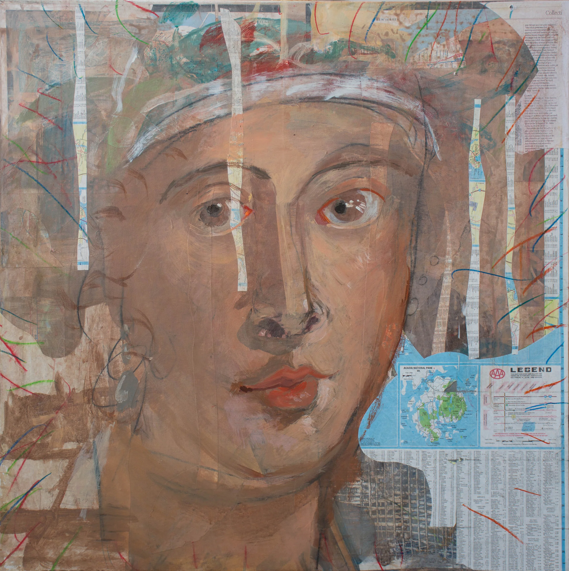 below you see the painting before my collage intervention, where i'm indicating a dead spot in the composition, and on the right below you can see me collaging maps to the surface. they have been cut with a matt knife creating curves and suggestive biomorphic shapes which echo the natural curves of the face and introduce a shot of blue as a counterpoint to the earth tones dominating the painting. the suggestion of piero della francesca in the head piece was unintentional, and i think enriches the mystery of this rubens inspired image.