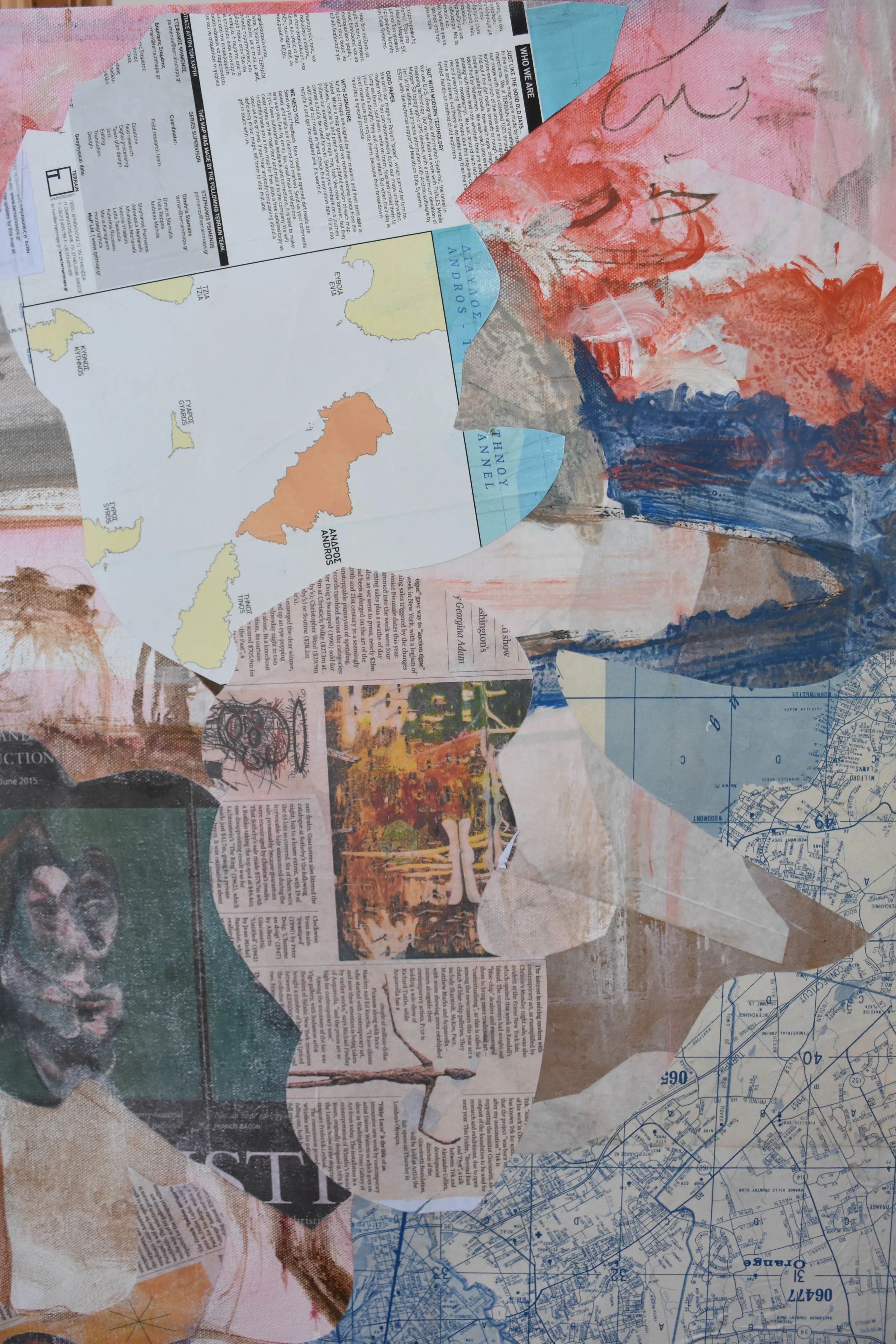 11:54 am: work continues on grey 10, with numerous new collaged elements, including articles on francis bacon and roy lichtenstein, as well as a vintage new haven map courtesy of my dear friend dan, lower left, and a map of the island of andros, sent to me by my son dimitri, lower right.