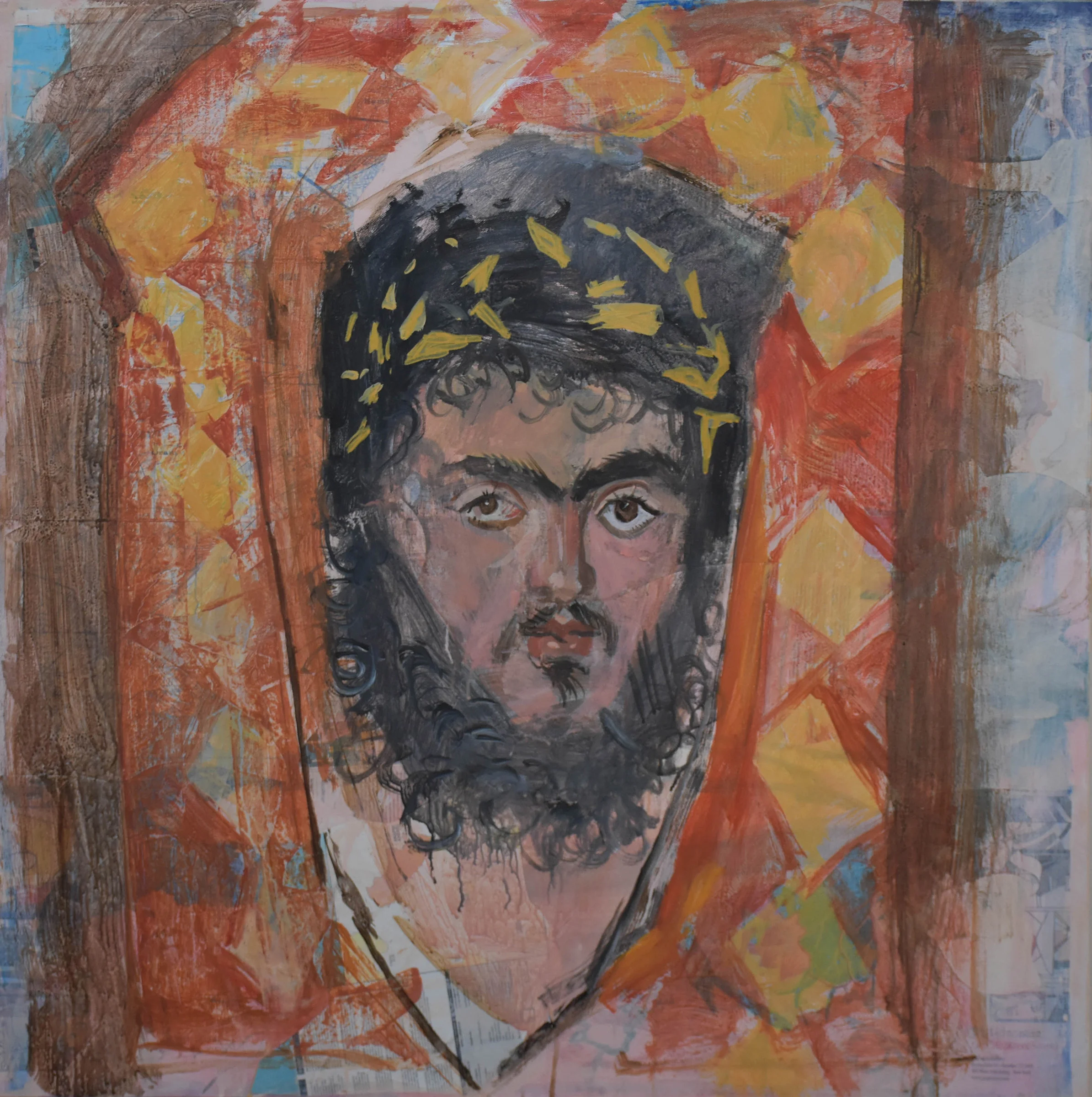 1:59 PM: and here's the latest state, with 3 details below. it's easy to see how the fayoum portraits are the link to early byzantine icons found in the sinai, as doxiadi suggests in her book. both are in encaustic on wood panels and both reflect the earlier classical greek portraits which we only know from descriptions. had these portraits, painted in about 150-250 AD, not become part of the ancient egyptian mumification and burial rituals, they too would have been lost. they are perhaps the earliest examples we have of the painterly in art history.