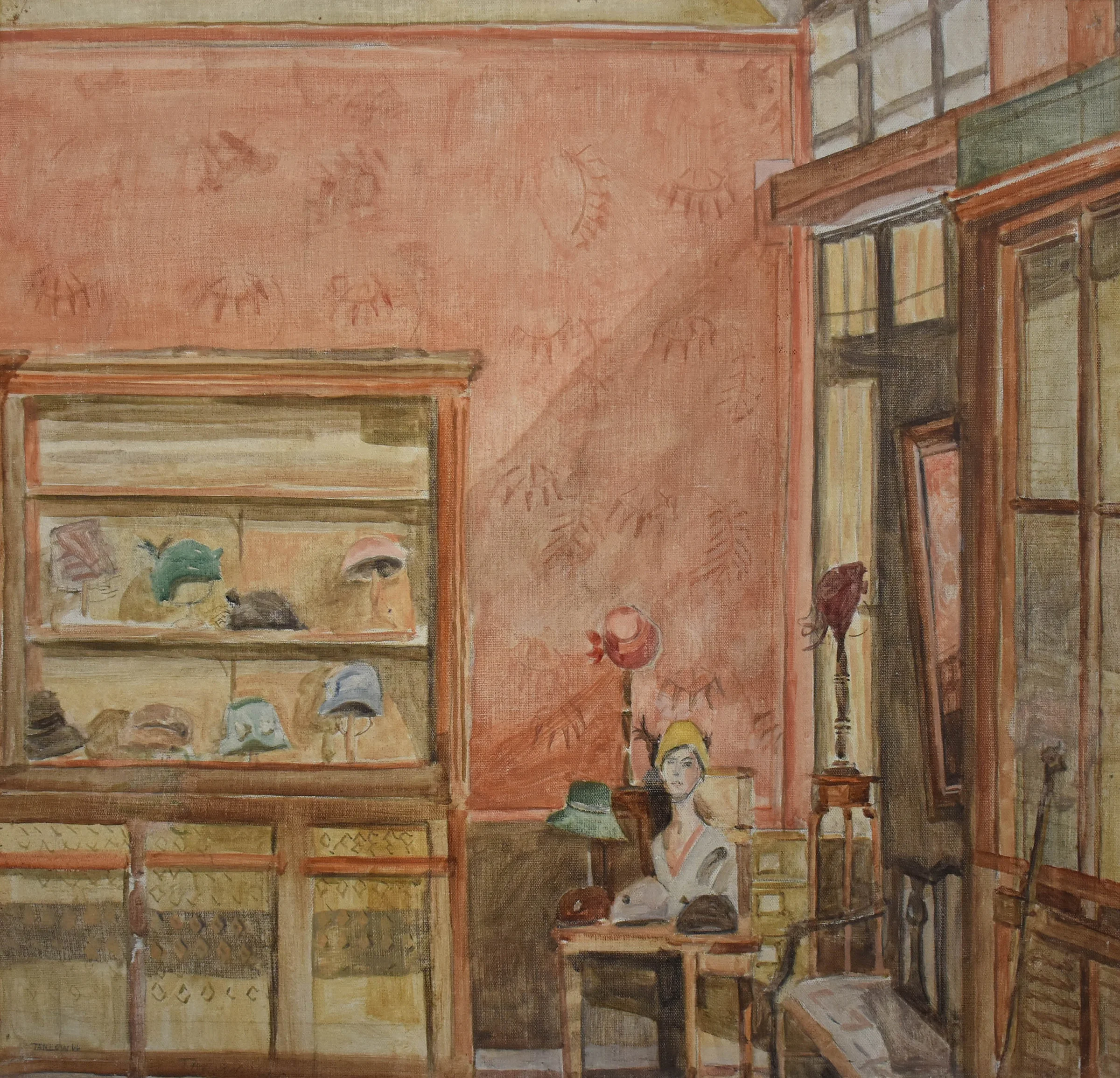 this is a painting in oil on linen, done in 1967 at a hat shop in piraeus, where my former mother-in-law niki karagatsi and i used to go together. it's from the estate of my mother, liz gitten.