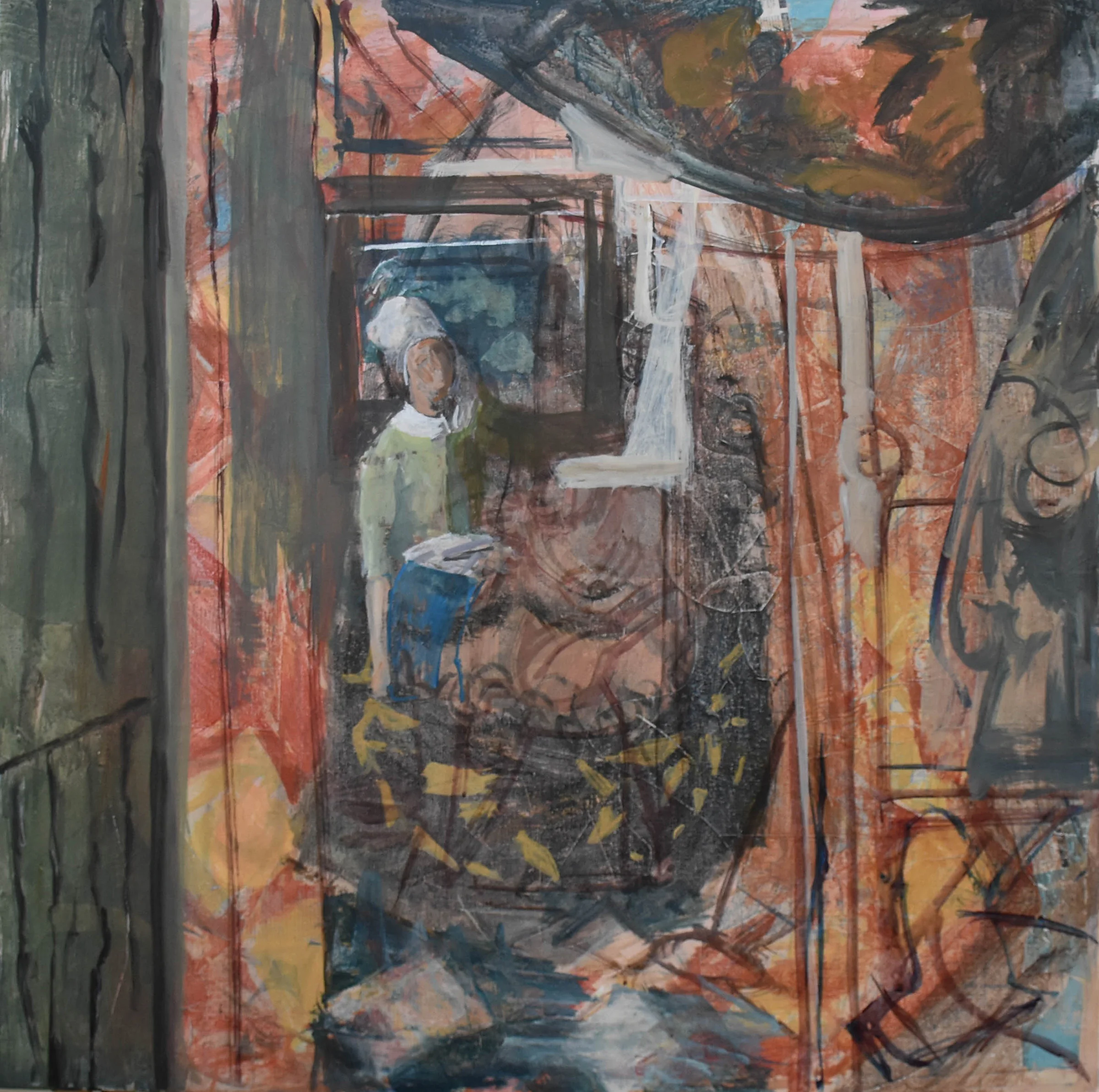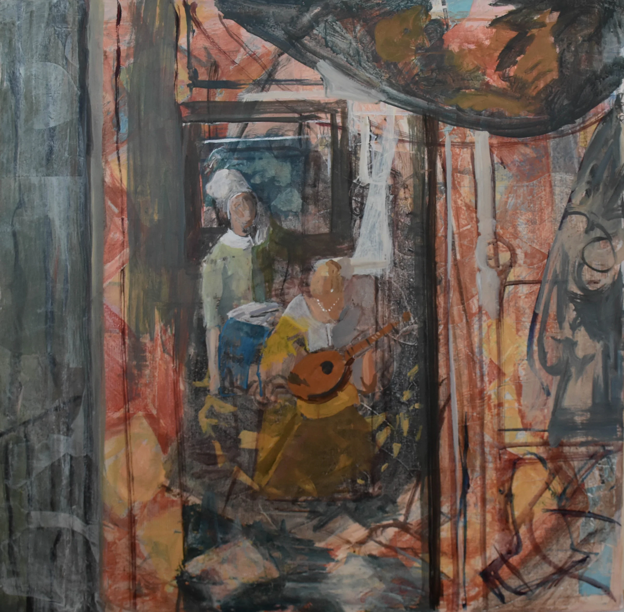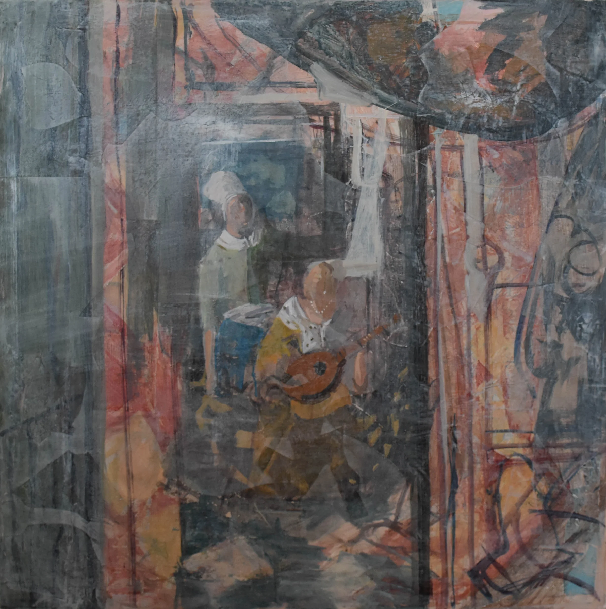 noon: the painting has been flipped upside down and the new image is starting to appear, based upon vermeeer's love letter. it has a textural richness and mystery that would not have been possible without the collage overlayed with the fayoum portrait inspired painting.