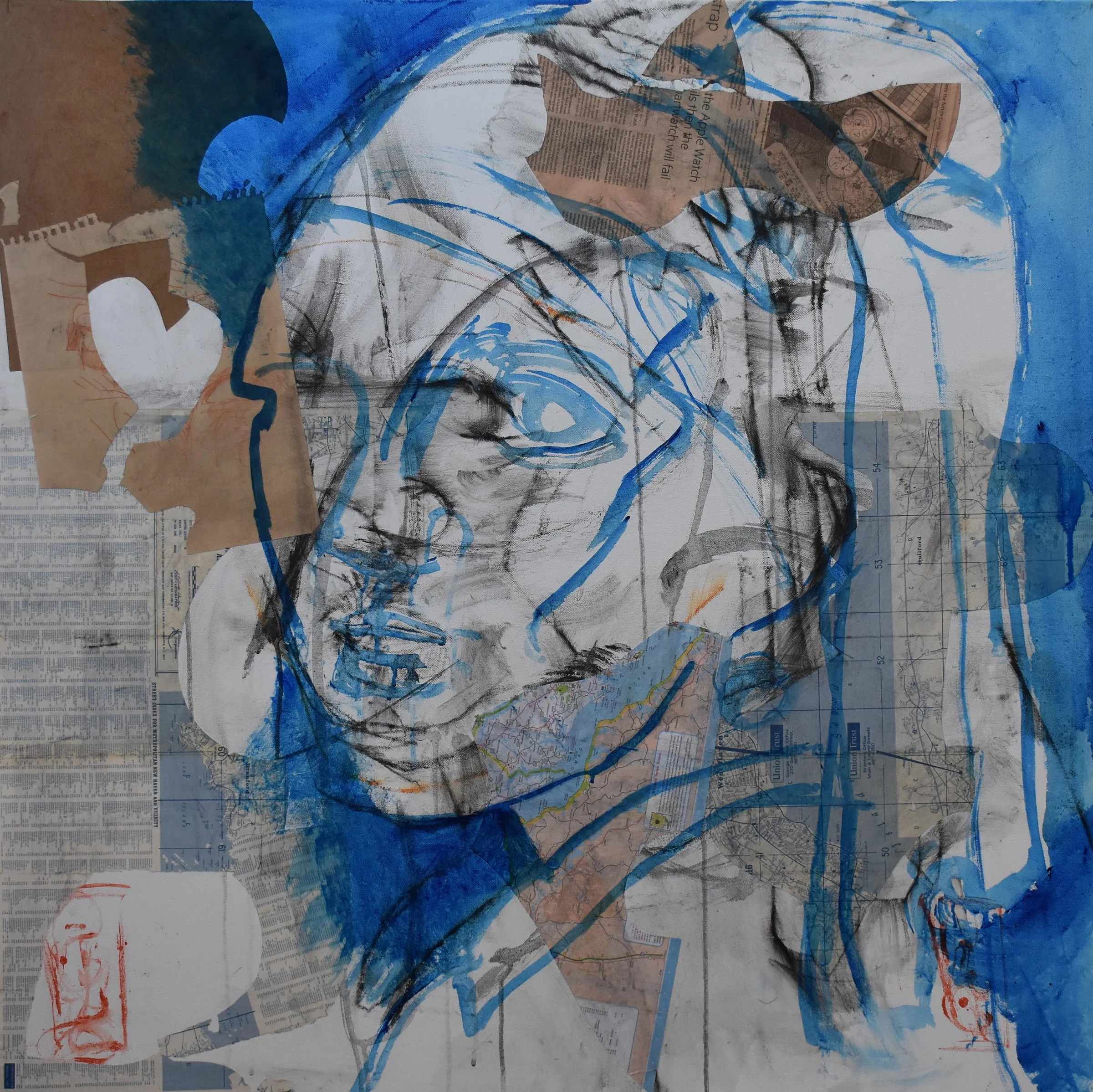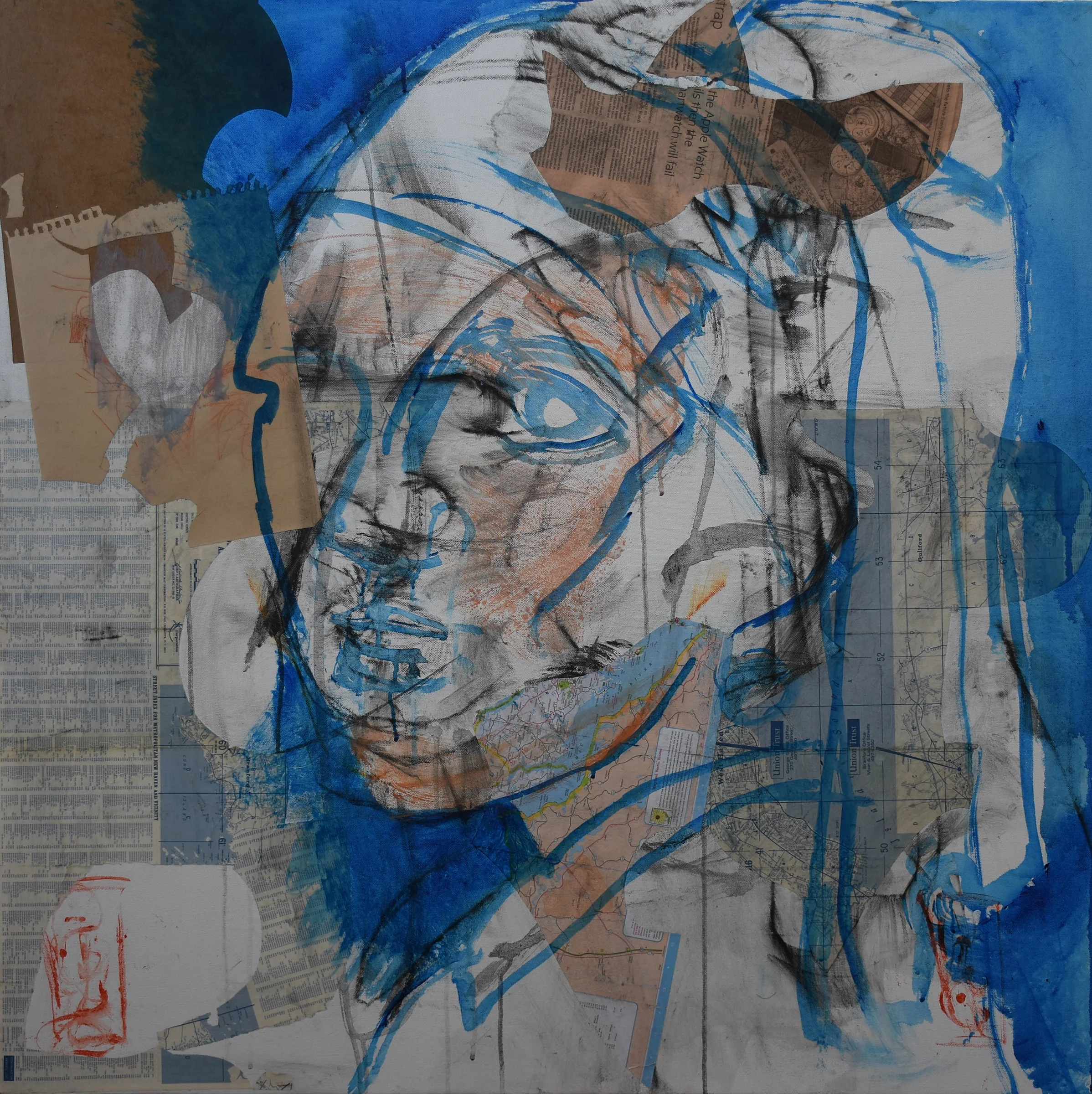 12:20 PM: here's stage 3 of grey 12. collaged elements have been introduced and painted over with sennelier phthalo blue acrylic. it's occurring to me, and i've had this thought before, that i'd like to do a series, with all the major stages of a painting. so, for example, i'd stop here and start a new one, which i'd take a bit further, then start another one, etc. cool, don't you think? i think 6 would be good. so i'd need 6 canvases stretched over masonite for collage support. and that, my friends, is one of the values of keeping a blog. it's like you're in conversation with yourself, but you know others are following. SO cool!!