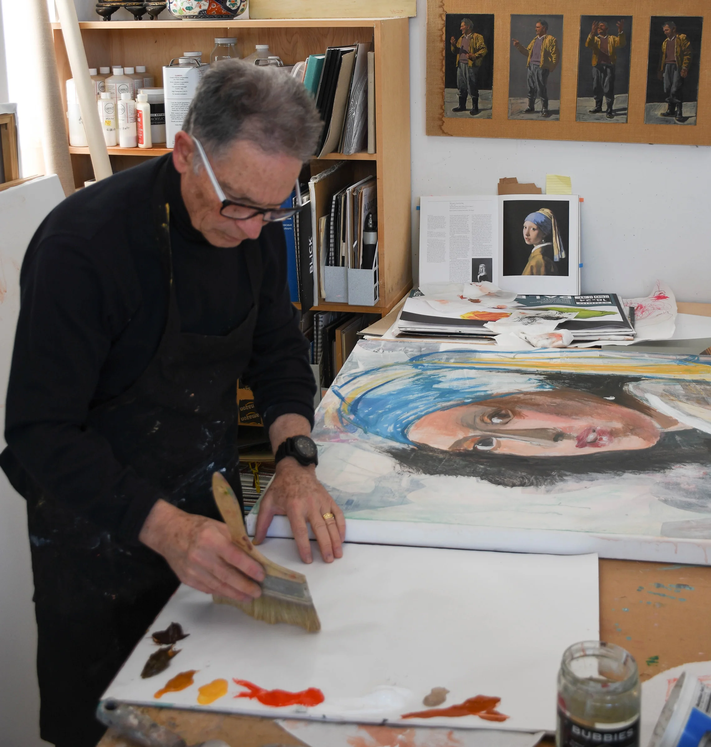 a word i made up to describe the process of loosly applying a wash of off white to the entire surface, and then scraping/rubbing/dragging the palette knife over the surface while it's still wet, then painting back into it. the eye, rather than getting stuck on the details, such as lips, eye or hat, moves smoothly across the picture plane. there is more choice, more freedom on the part of the viewer to alight here or there. the mind/eye fills in suggested details as it fabricates it's own meanings. one has the capacity to dream more easily, while at the same time being able to notice and appreciate the painterly passages as painterliness.