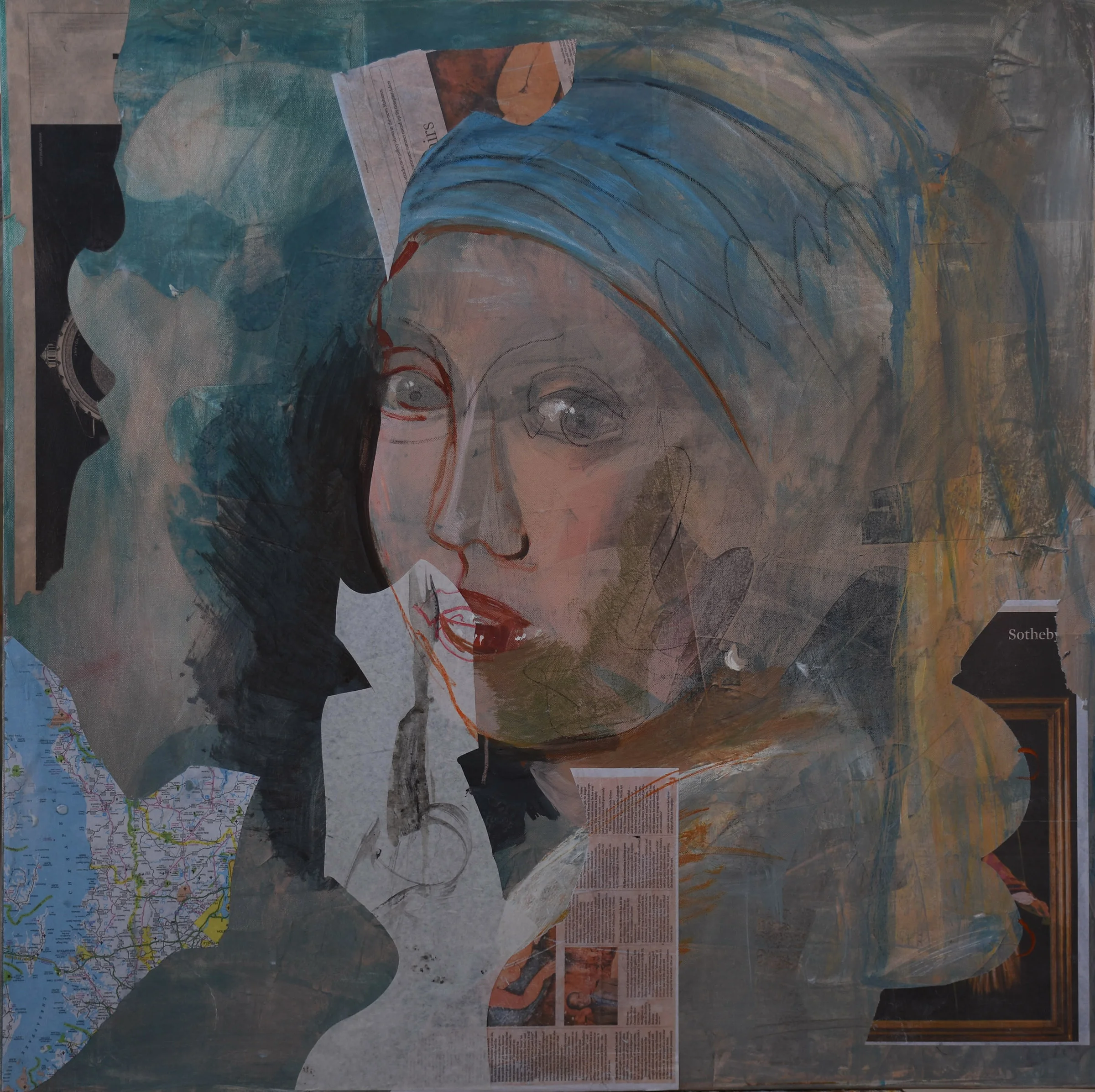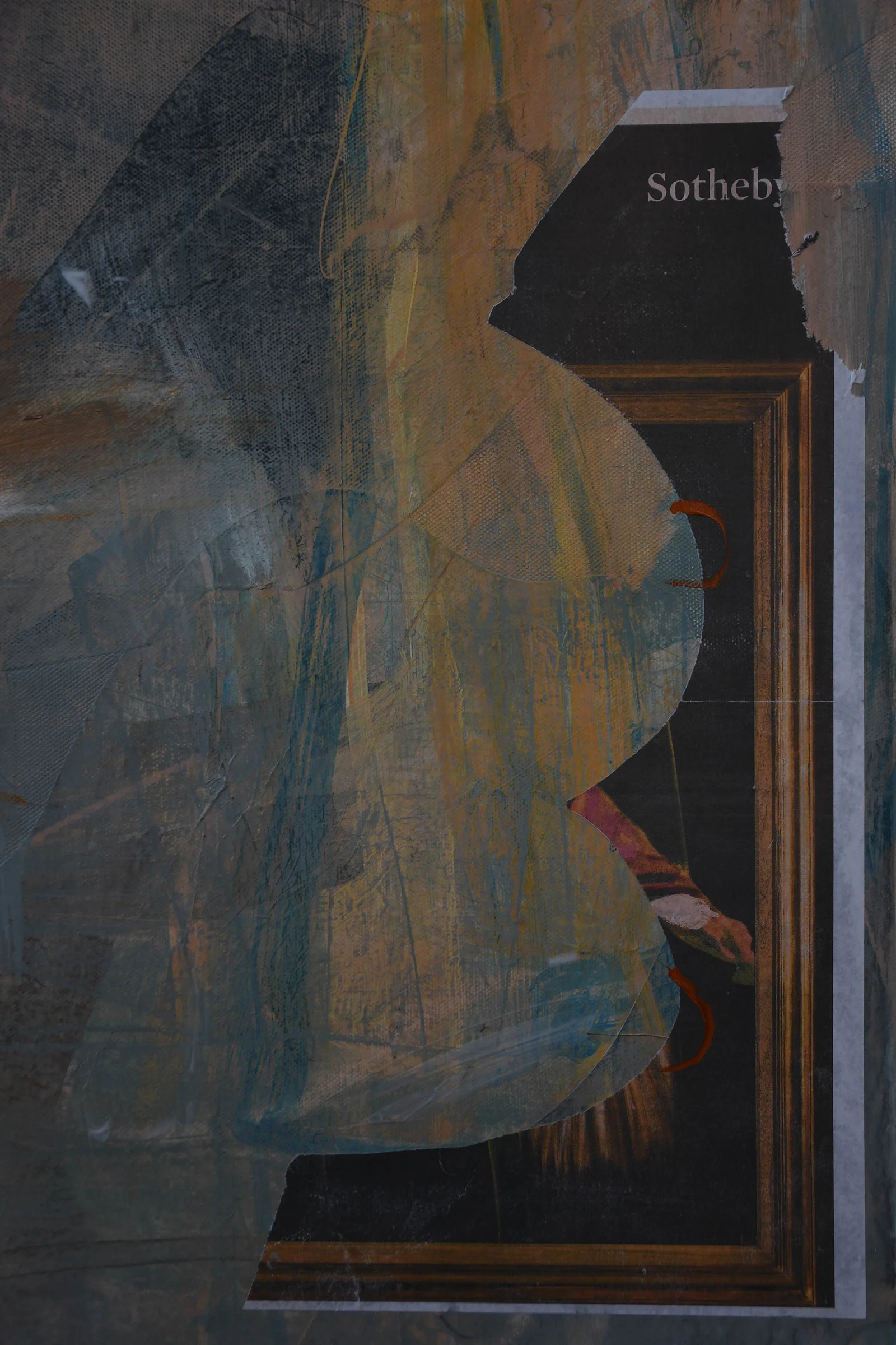 i introduced more collaged elements, including a bit of francis bacon and a map. it was getting boring & needed a kick in the pants. BELOW left: the current state, and on the right, a detail.