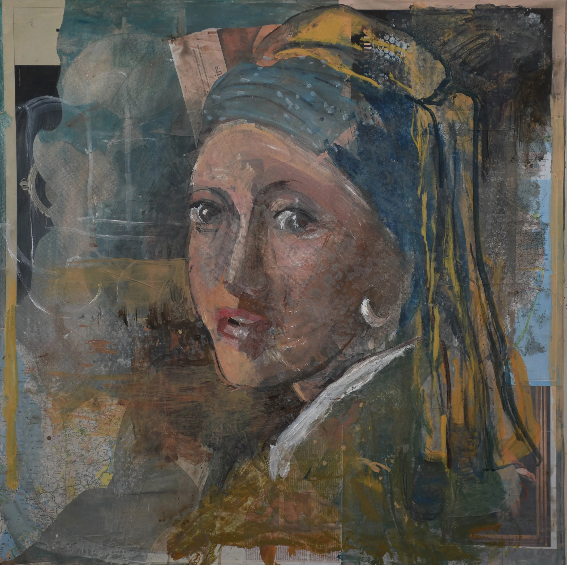 the painting has definitely improved after todays work. it's more cohesive. as usual, i'll know in the morning whether it needs further work. my discovery of pressed bubble wrap drenched in color as a means of creating texture is exciting, and i'm trying not to overdo it. mindlessness sucks. but i feel it does mirror vermeer's use of the camera obscura to break the image up into little dots of color.
