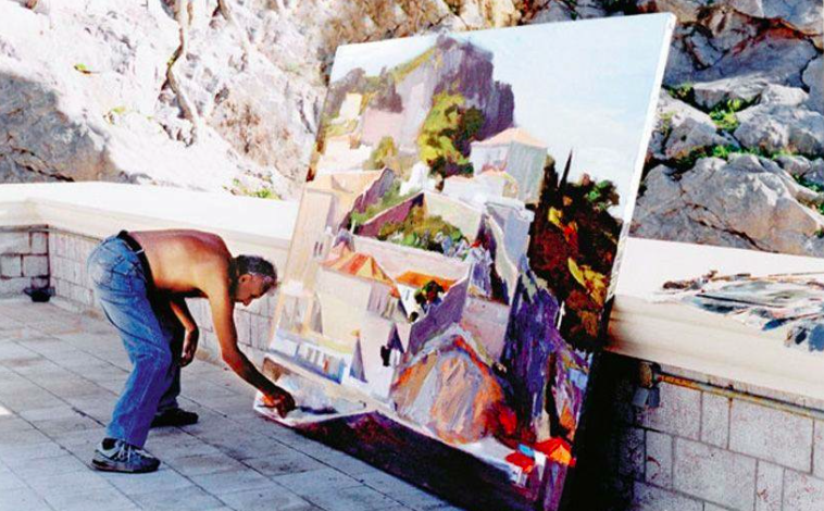 i was moved when he showed up at my 2006 and 2010 shows at skoufa gallery in athens. as always, generous and spot on with his observations and comments, he was an uplifting presence, always. this photo, which was posted on facebook, eloquently reveals the depth of his passion for painting, and how he made the greek landscape his own. it takes BIG balls to do what you see him doing here. thank you, tetsi.