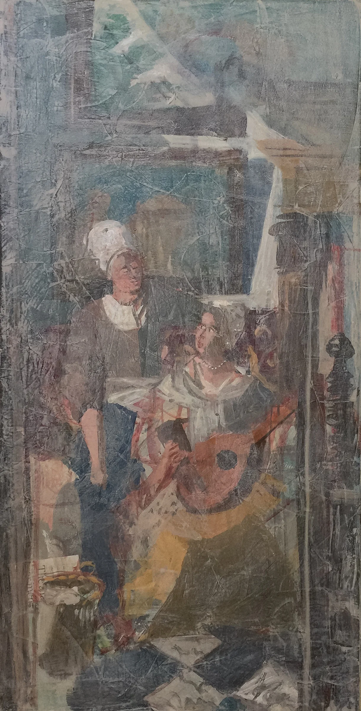 there was no mystery in the previous version. once again, it was a woman playing a lute and showing a note or letter to her maid. it needs to be about painting...marks on a surface; space; color....