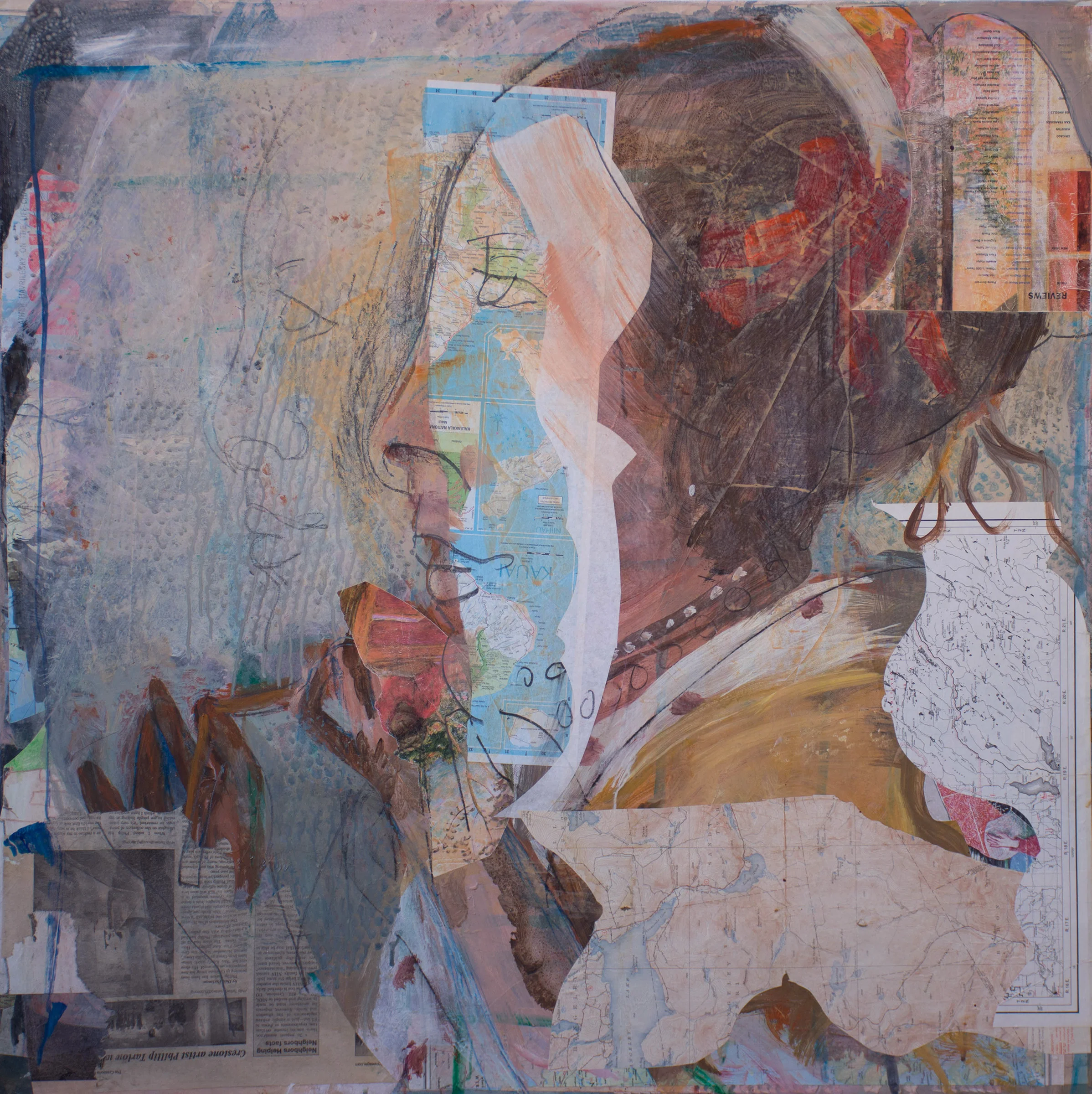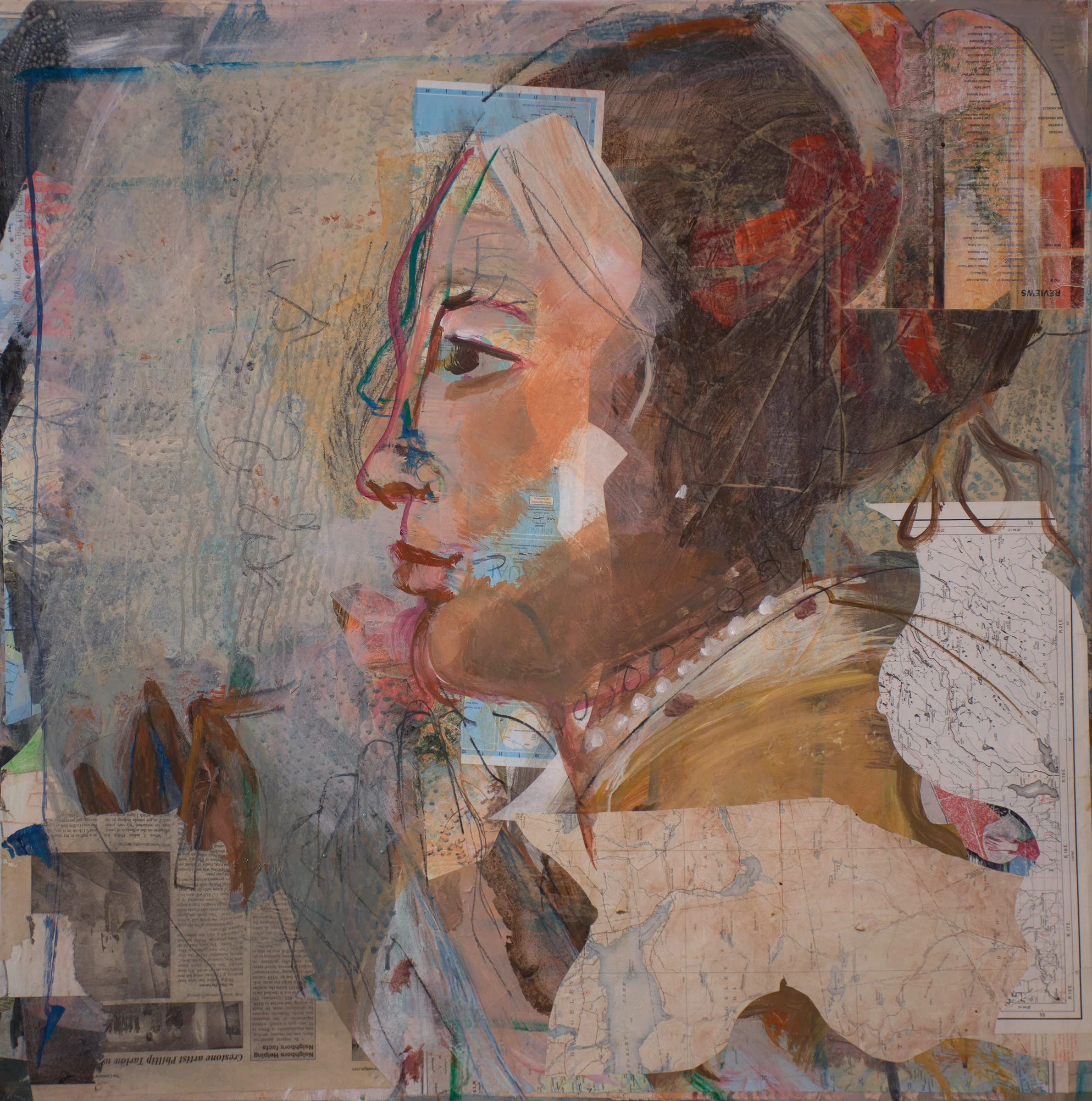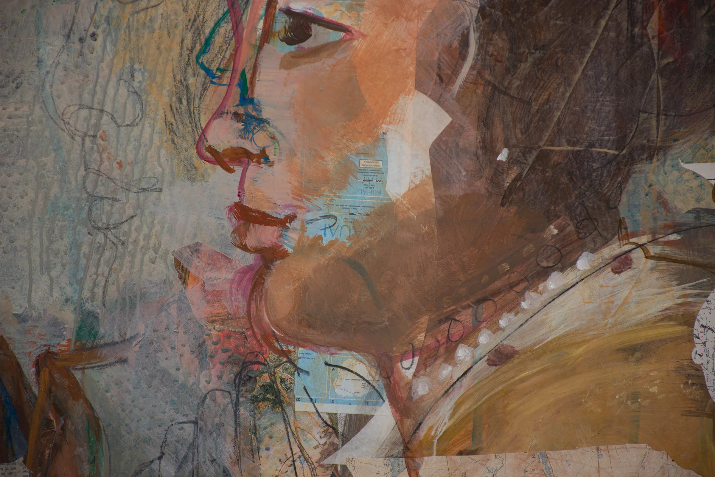 2:44 PM: some more work has been done on grey 12, re-introducing the face of the woman with the necklace without becoming too subject specific, and maintaining a good balance between the specificity of the face, and collaged and graffiti-like elements. in person it has a warm, rich tone. it's abstract enough to allow the viewer space to dream.