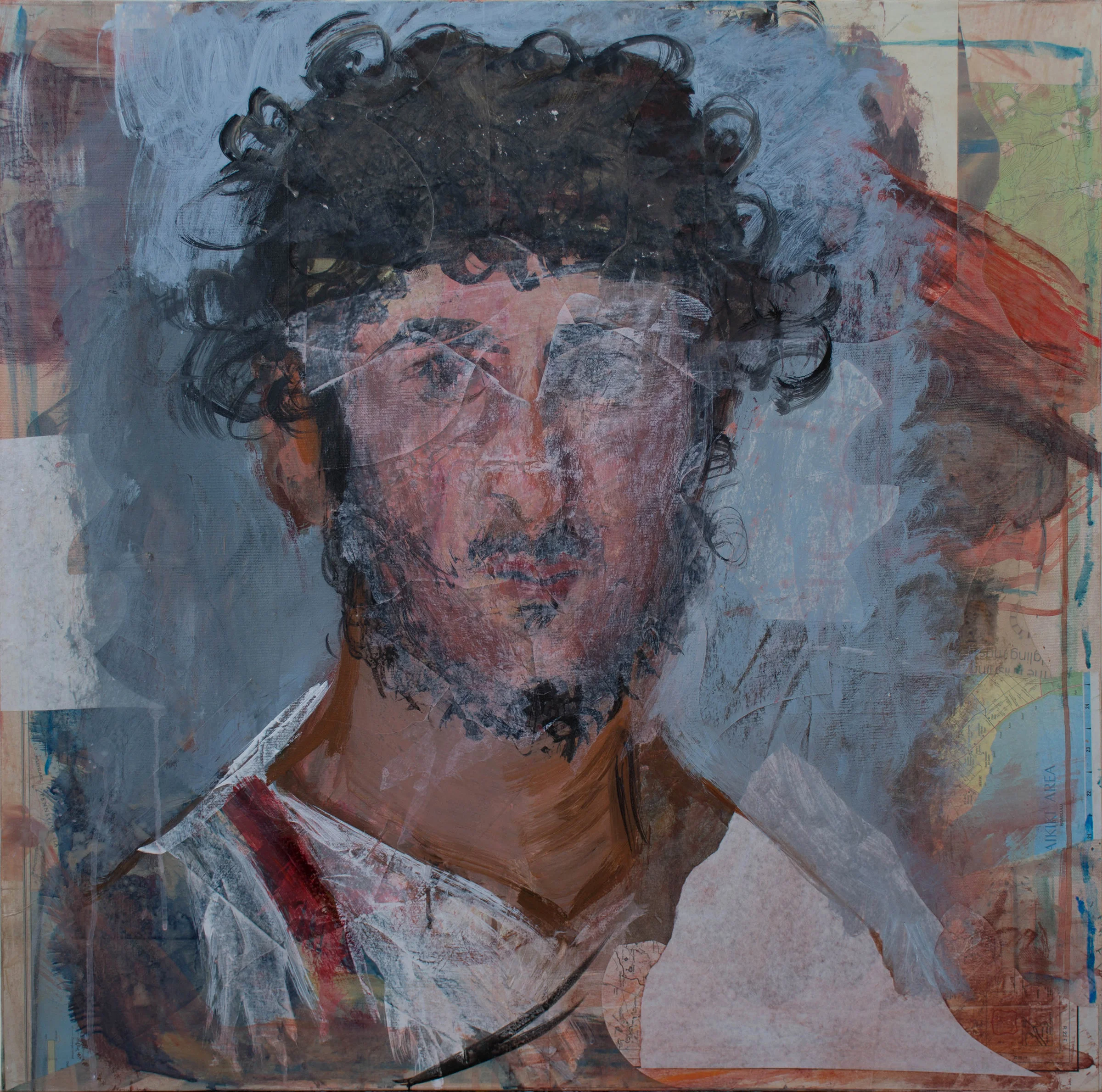 the swirls of black hair in the beard and head are always a painters dream. painters throughout the ages have delighted in them, from the fayum painters to vermeer and titian. the white tunic is also a device painters have loved introducing, whatever form they might take. i have to sit with this one for a while to determine my next step, if there is one. below, a few earlier stages of this painting, starting with may 15 on the left, through this morning on the right.