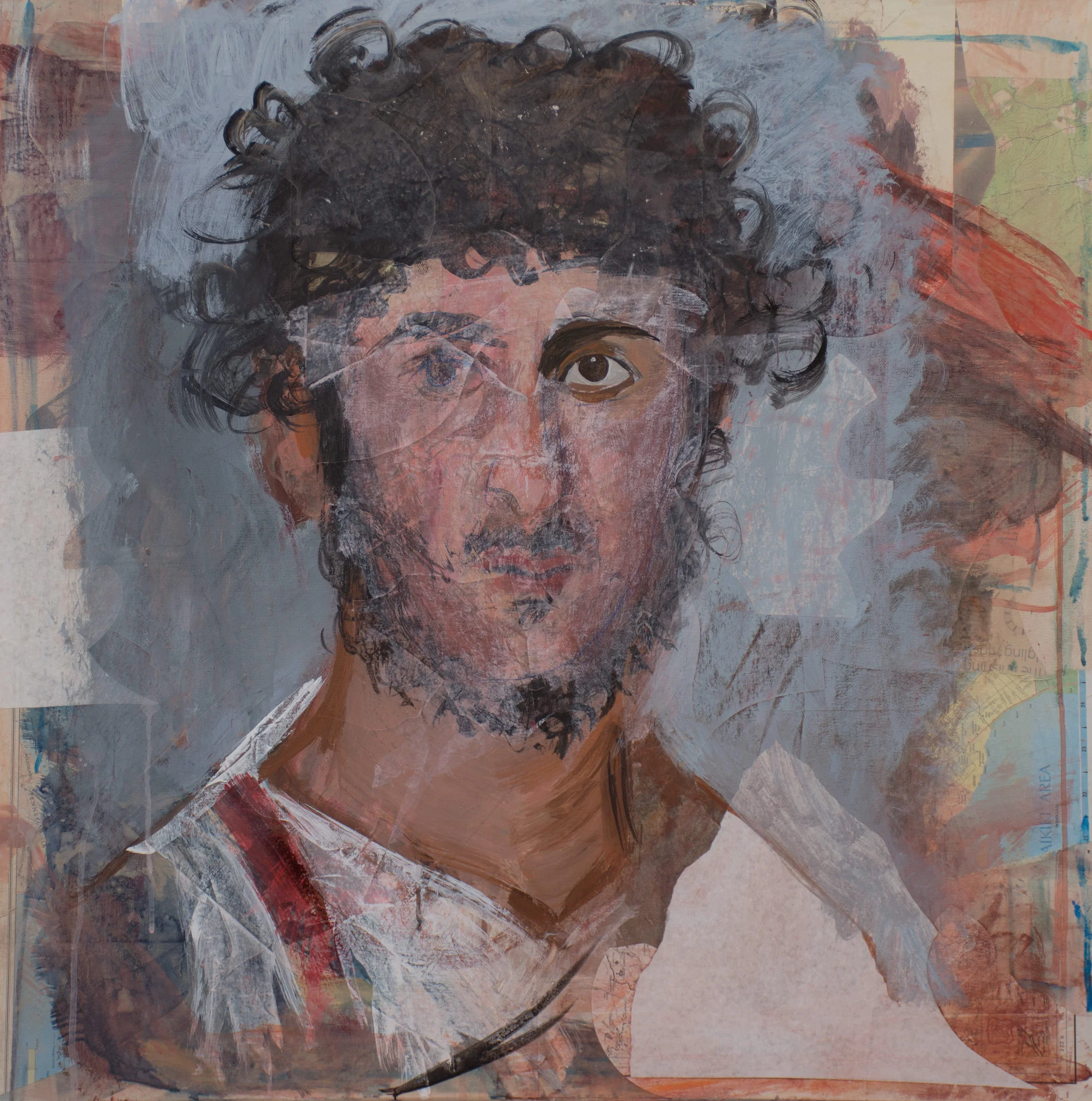 2:34 PM: since re-entering my studio for the first time in a week, i've been re-working grey 21, which is now drawing from a 1st century fayum portrait. the surface is now heavily layered, with scratches, scrapes and with some of the underlying collaged maps peeking through. i think the green bit of map on the upper right adds a critical balance to the overall current composition, as does the bit of blue ocean in the map on the lower right.