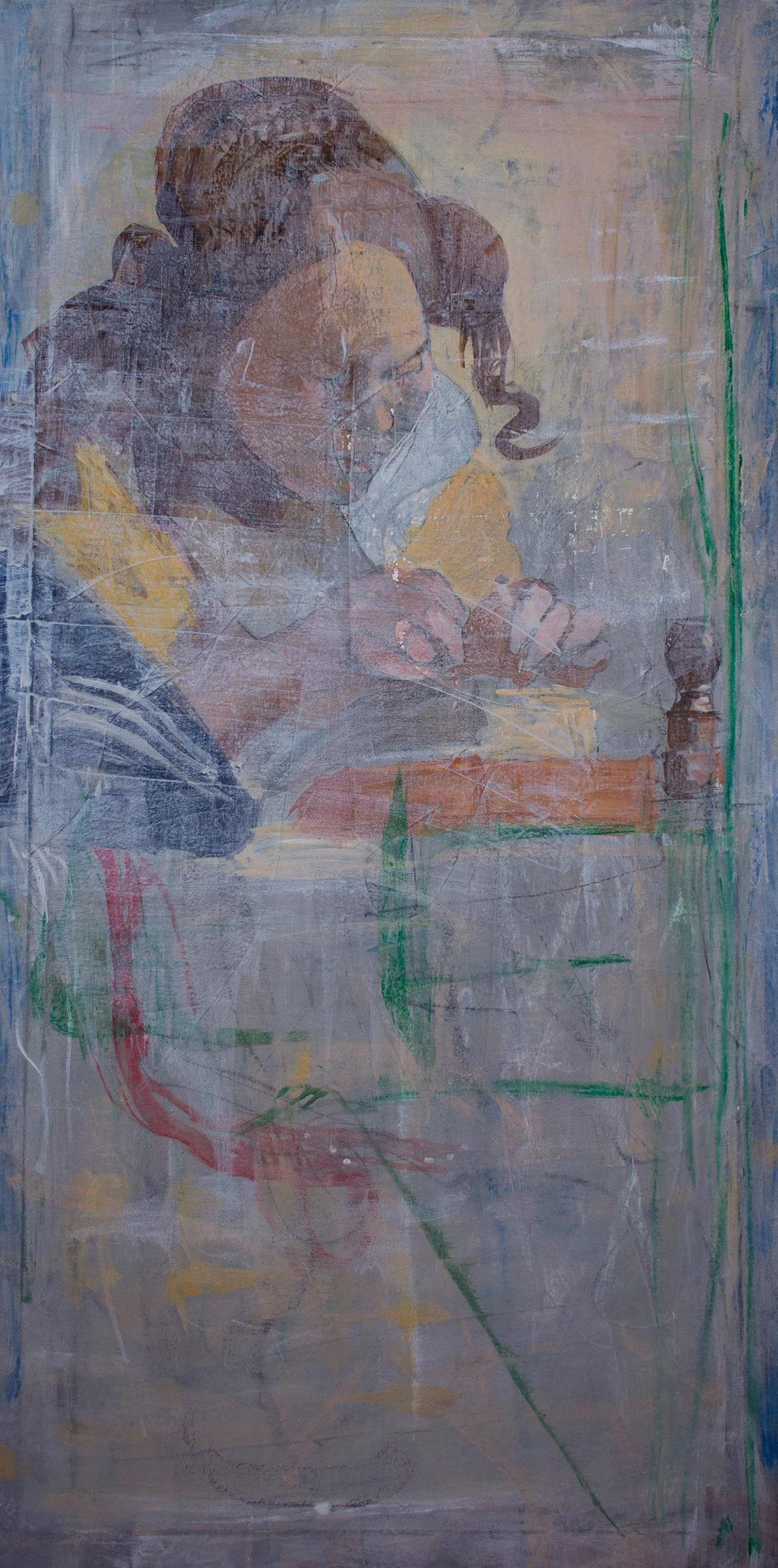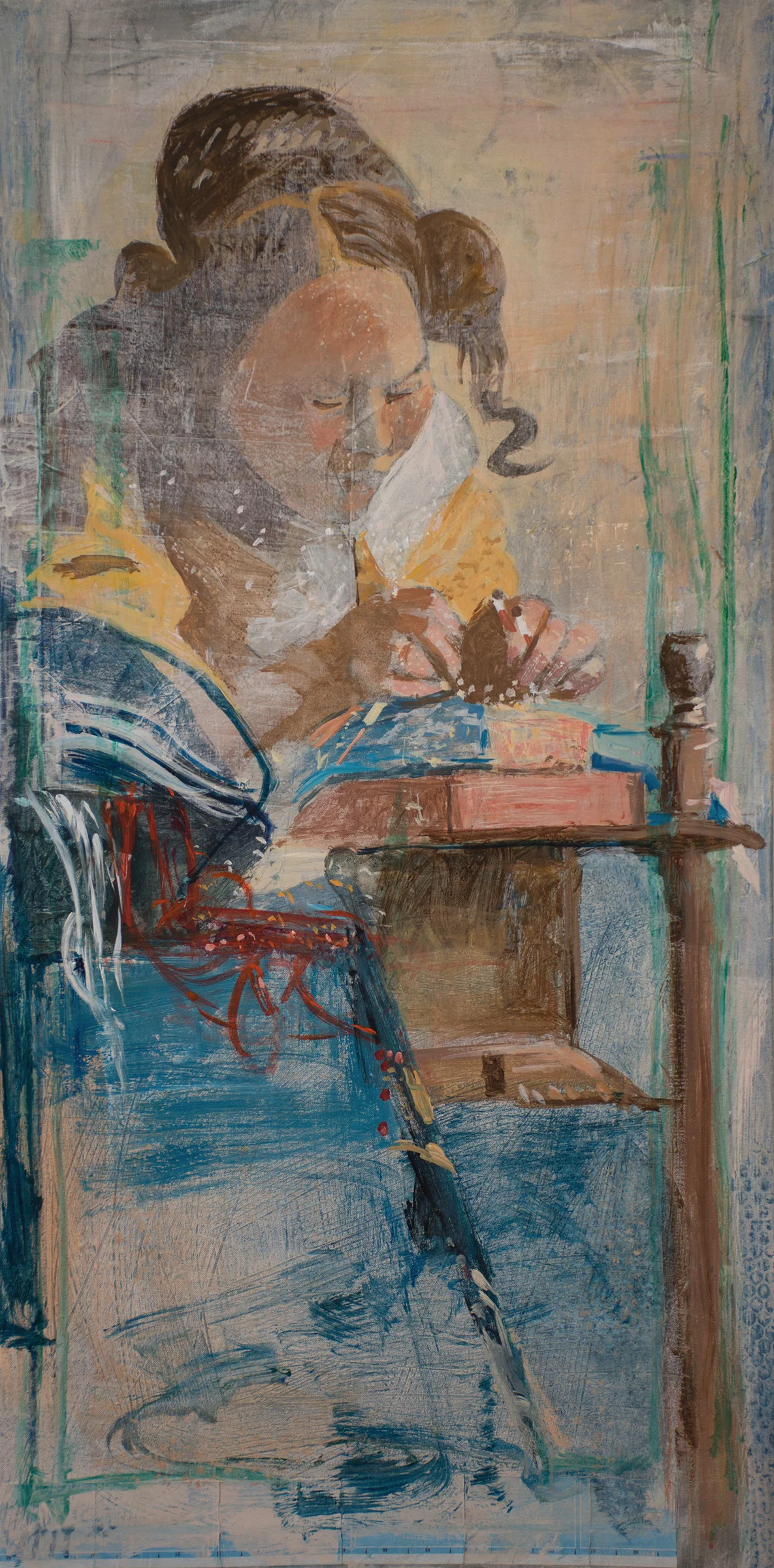 12:59 PM: following yesterday's revision of grey 9, i embarked this morning on a revision of the lacemaker. for some reason i can't figure out which number this is in the grey series. the numbering needs updating & i don't have time right now. so here's where it's at; clearly the lower portion, with it's intense blue, needs work. but i think there's an improvement to the upper half of the painting. part of the reason i decided to go back into this one was that the composition seemed cut in two. boldness is required to correct that. so i'll have a bite to eat and launch back in.