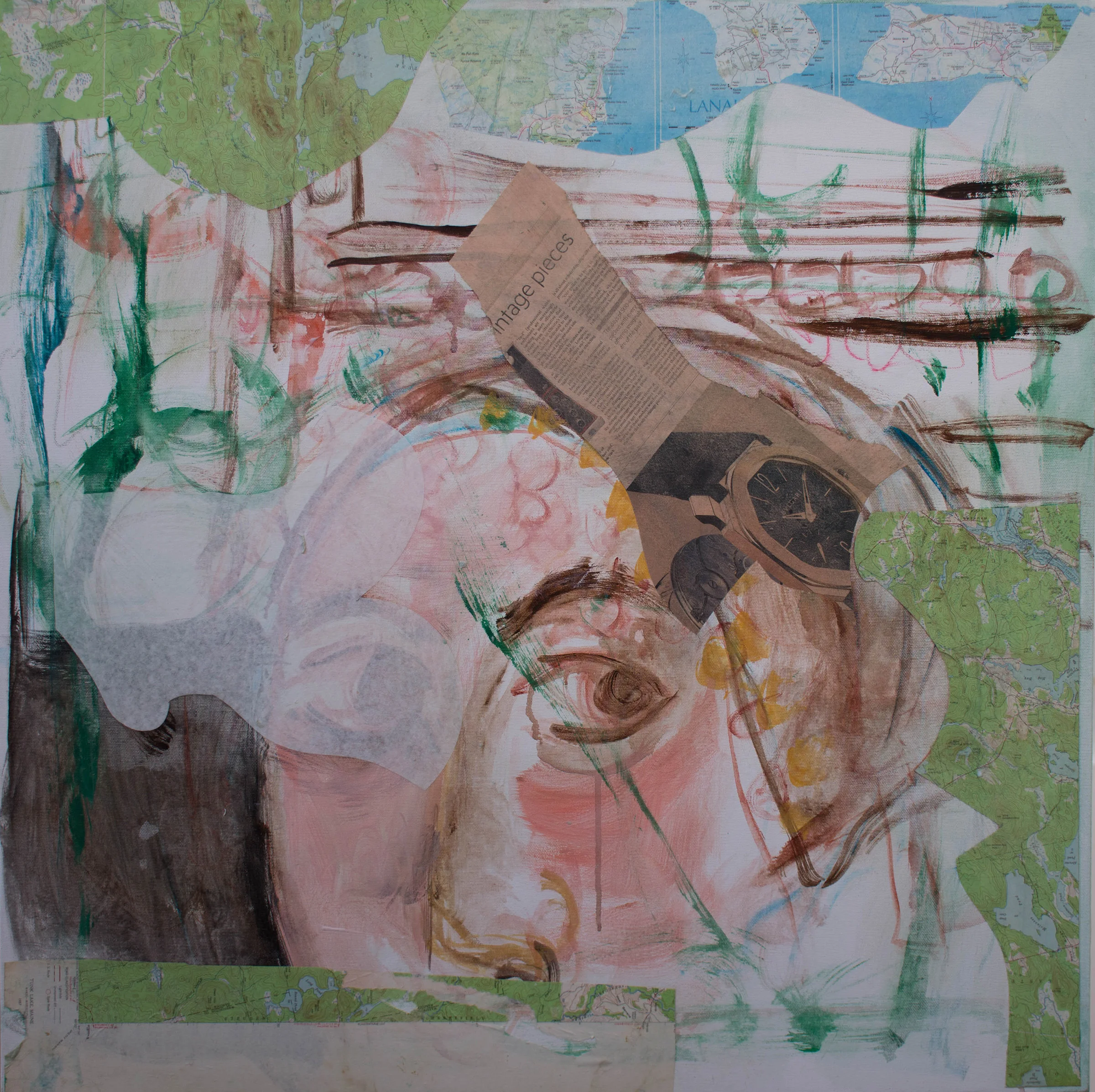 1:44 PM: the first layer of collage has happened. i'm enjoying looking at it in this state. as usual, my mind cuts in and says "hey, why not just leave it as is? it's so fresh; so whimsical......." and, indeed, i may stop early and give it a chance to exist, whether i work back into it or not.