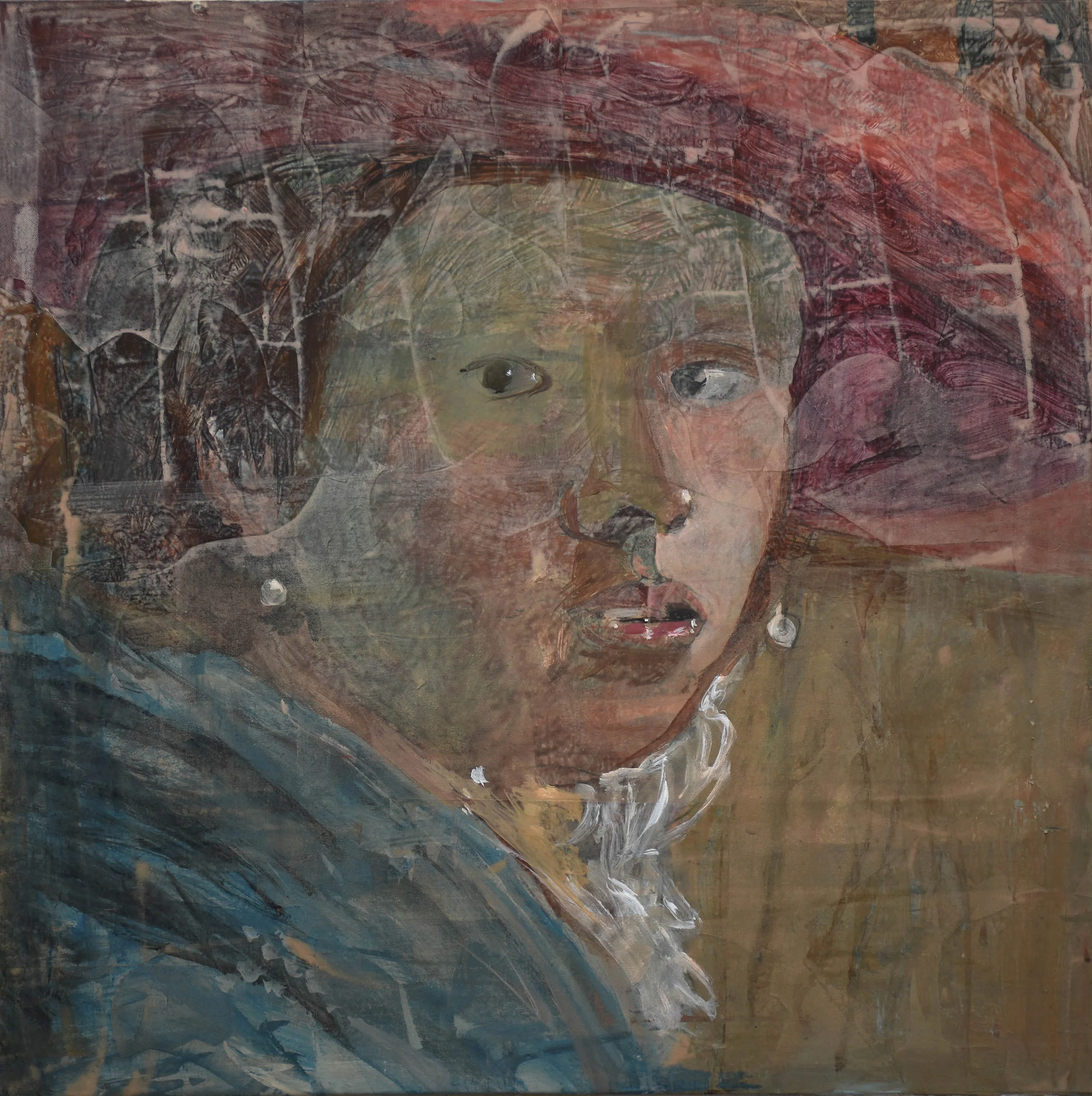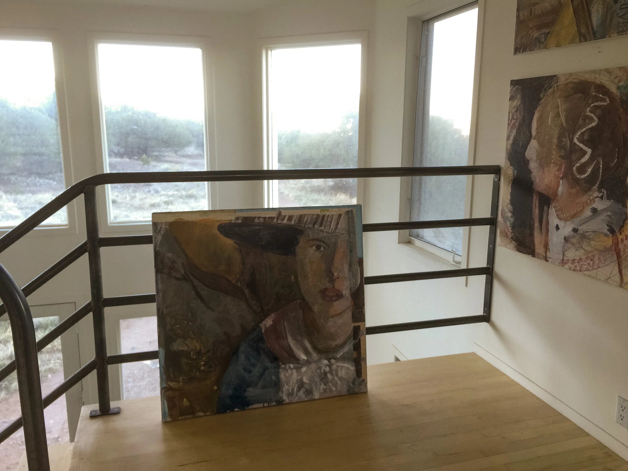 7:13 AM: grey 20 has passed the gaze test, having been on our north living room wall overnight. so today it's going back to my studio, where it will be removed from it's wood backed stretcher bar and re-stretched. it's presence in the house has highlighted weaknesses in some of the other grey series paintings, which i'll start revising, starting with grey 12, inspired by the girl with the red hat. at the same time, i'll be starting a new one, 32x32." on the right, grey 20 leaning against the railing, about to be brought over to the studio for re-stretching after passing the gaze test.