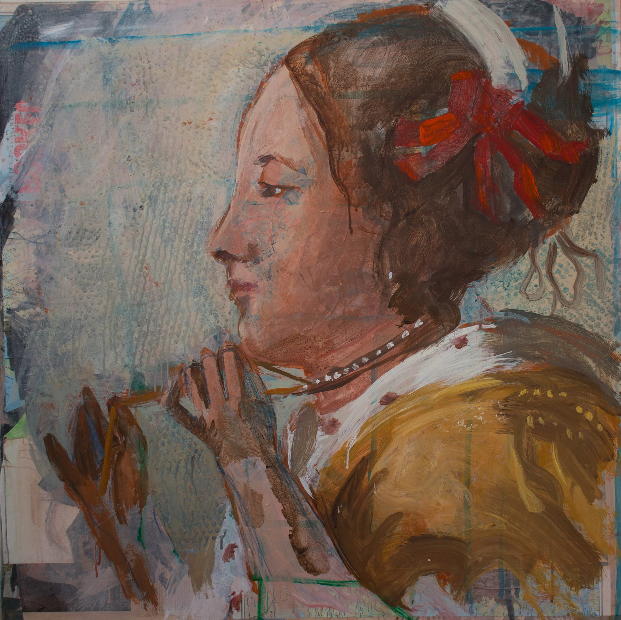 i did see, at the end of the night, that neither grey 12, nor grey 21 are resolved. so back to the studio they went. today all day i've been working on grey 12, originally inspired by vermeer's girl with the red hat. she's gone, and in her place, a second version of his girl with a necklace. there's already one version of her, which was one of the earliest in the series. if you go to my grey page in the drop down menu, scroll down & you'll see the painting on the very bottom row.