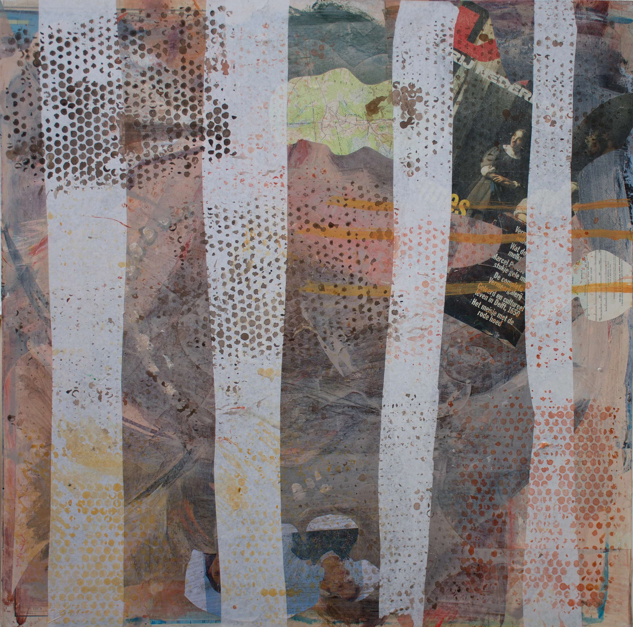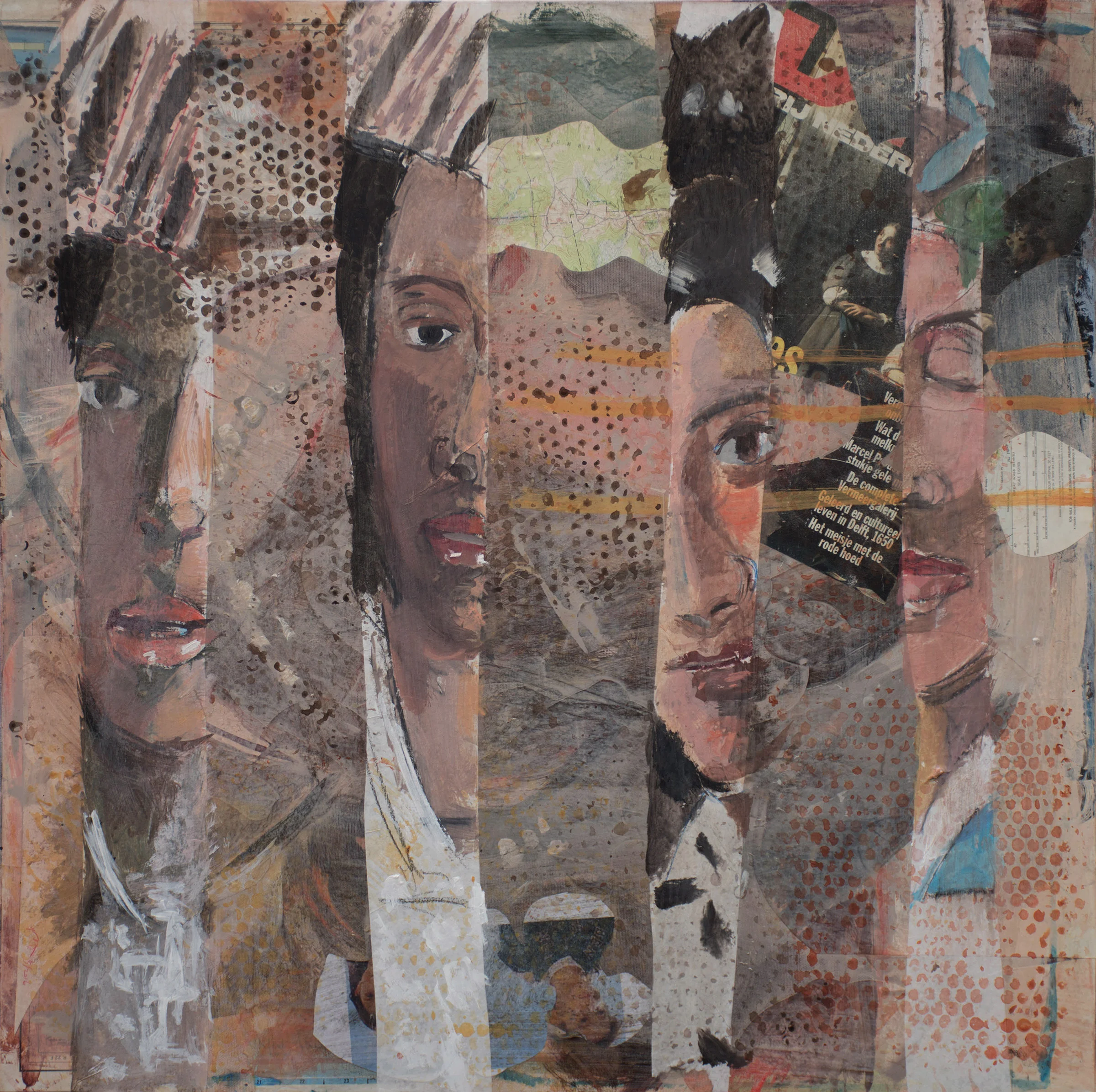 once i had collaged them onto the canvas, i had no idea what i was going to do next. i began with the first one on the left. on an easel directly to my left are some large print outs i made of vermeer faces. they were overlapping, and thus were cut off , leaving a narrow band of the image vertically. so that's how it started. now i'm going to put my attention on grey 23.