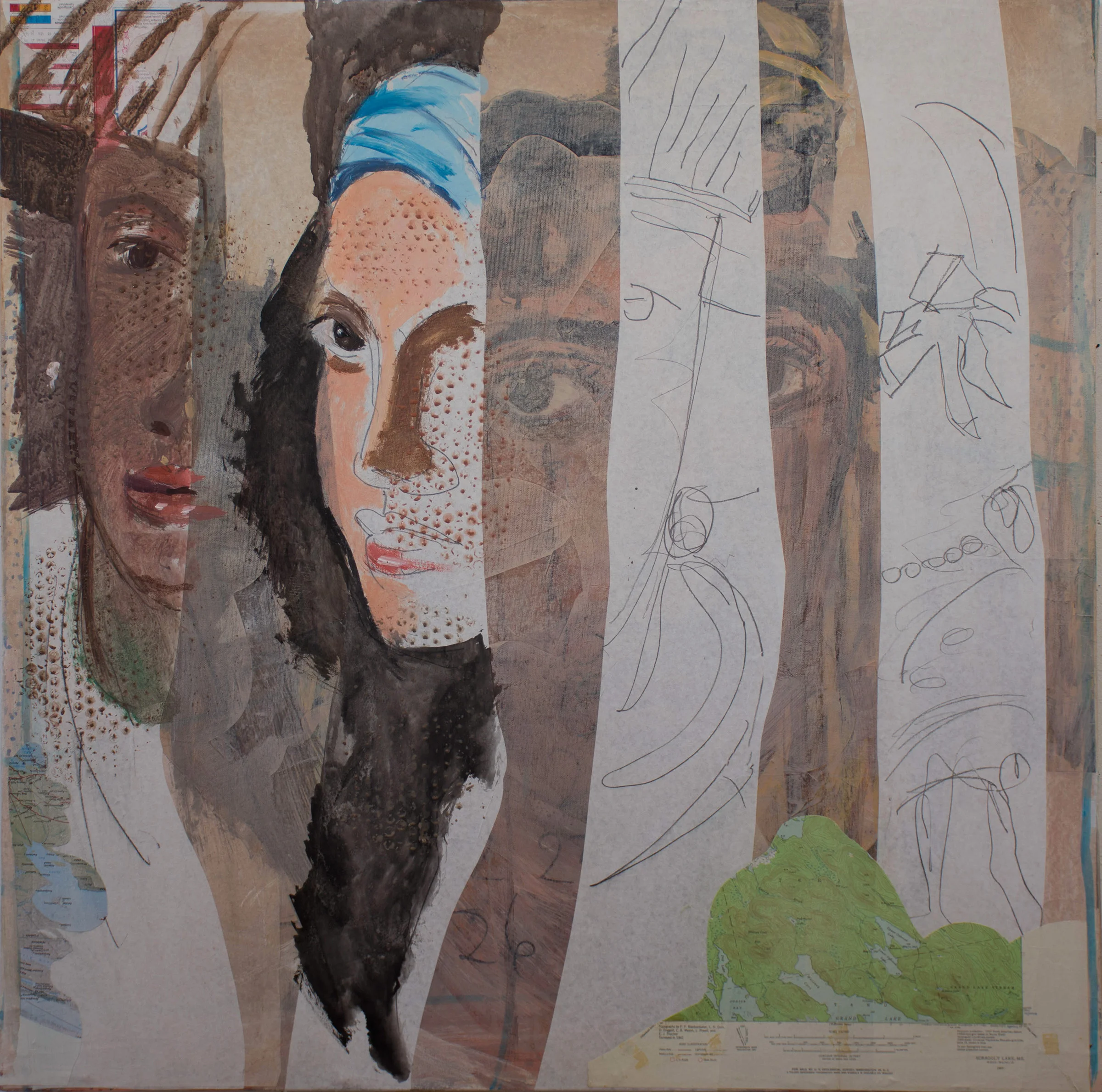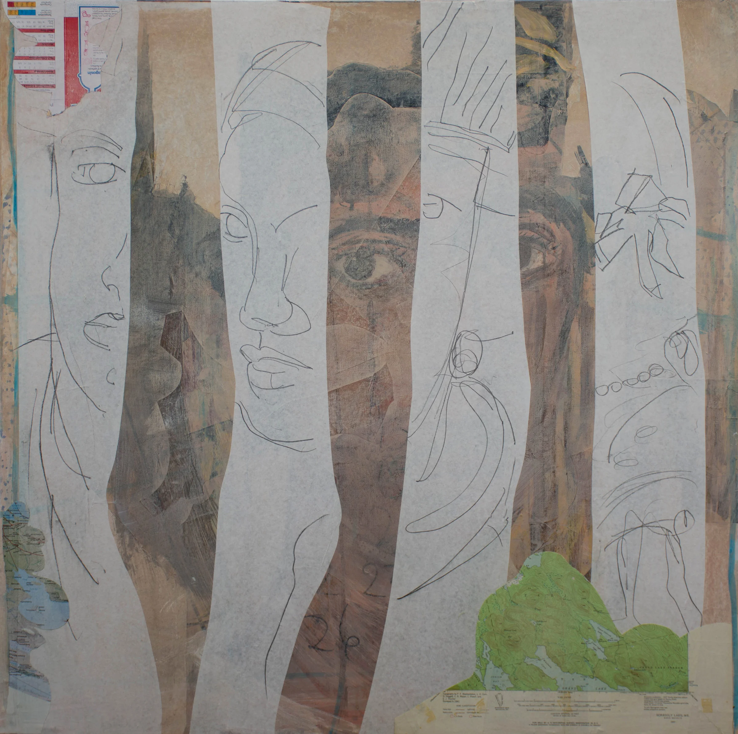 12:44 PM: current state of grey 24: off-white strips of paper have been collaged onto the surface and drawings have appeared on those strips, based upon vermeer prototypes. the singularity of the fayum image has gone and been replaced by a fluid, suggestive space. map elements have also been collaged onto the picture surface. one, in the shape suggestive of a breast, is from a 1941 us geological survey of scraggly lake, maine. which means it's likely that my friend dan, who gifted me this map, walked that territory as a child.