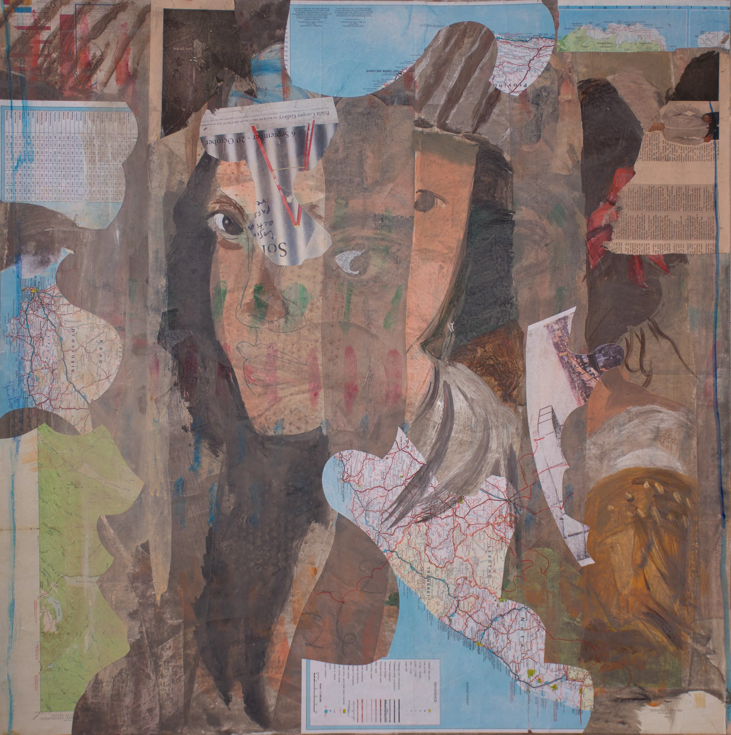 3:46 PM: so i let go of the idea of stripes, companion pieces and so on, and now, although the painting is not complete, the picture plane is more integrated. it reads as one event. if you take a look, below at the image accompanying my 2:16 PM post, you will see what i'm talking about. the random elements introduced by collaging create completely unexpected relationships, so that 1+1=3 or 4. in one sense, i start fresh with each new piece, despite the temptation to repeat something that may have worked in the last painting. on the other hand, i think you do get smarter about how you work technically, and how you filter and translate your unconscious into action. as well, you become more adept at actually listening to the painting itself as a living, breathing entity.