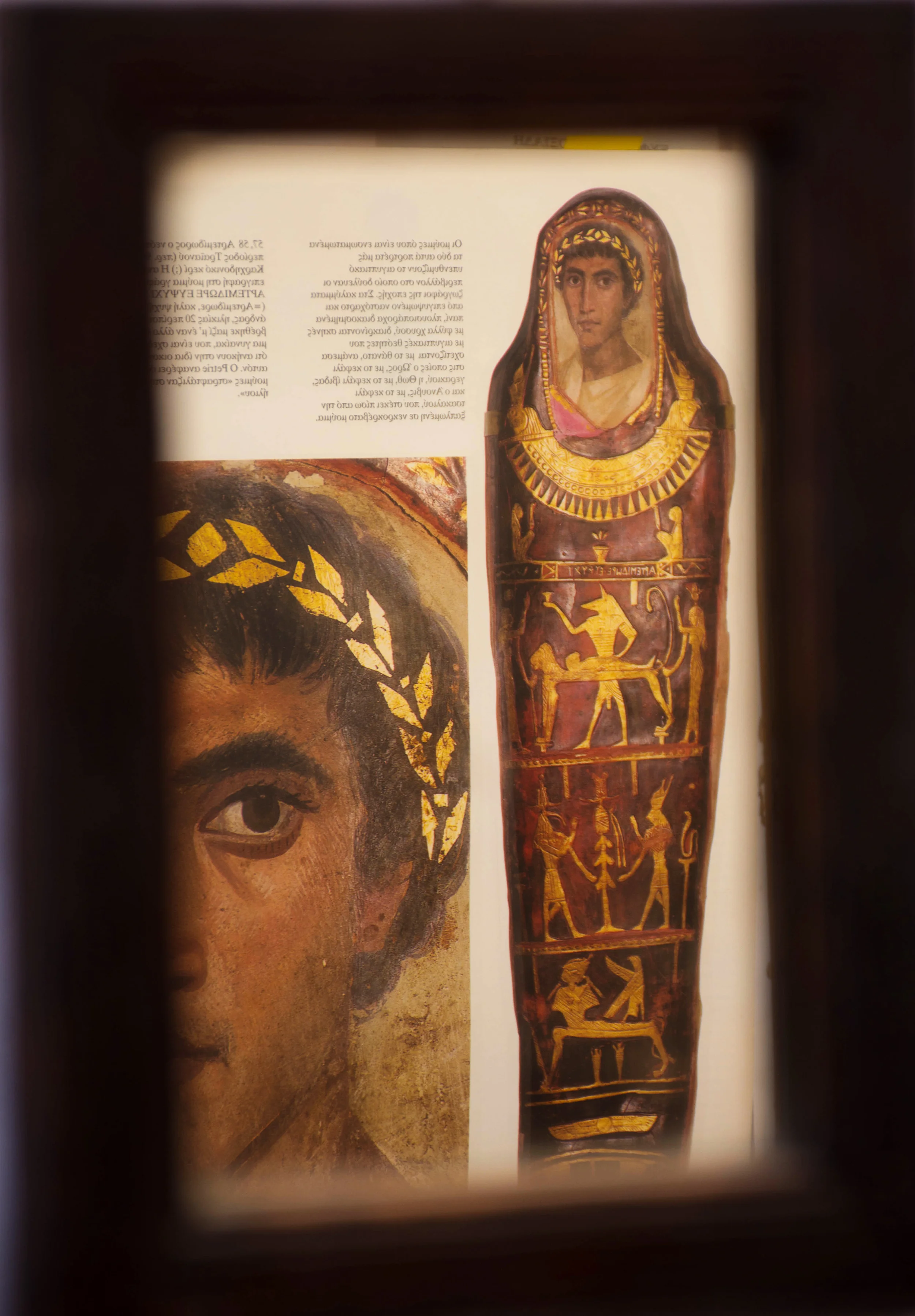 11:56 AM: after another stellar trail walk, i'm back in the studio, invigorated. i'm experimenting with shooting images in the mirror i found many years ago in an abandoned house in the village of aidonia, on the island of andros. the image in this case is a fayum portrait taken from the exquisite, award winning book by my old friend euphrosyne doxiadi in greece.