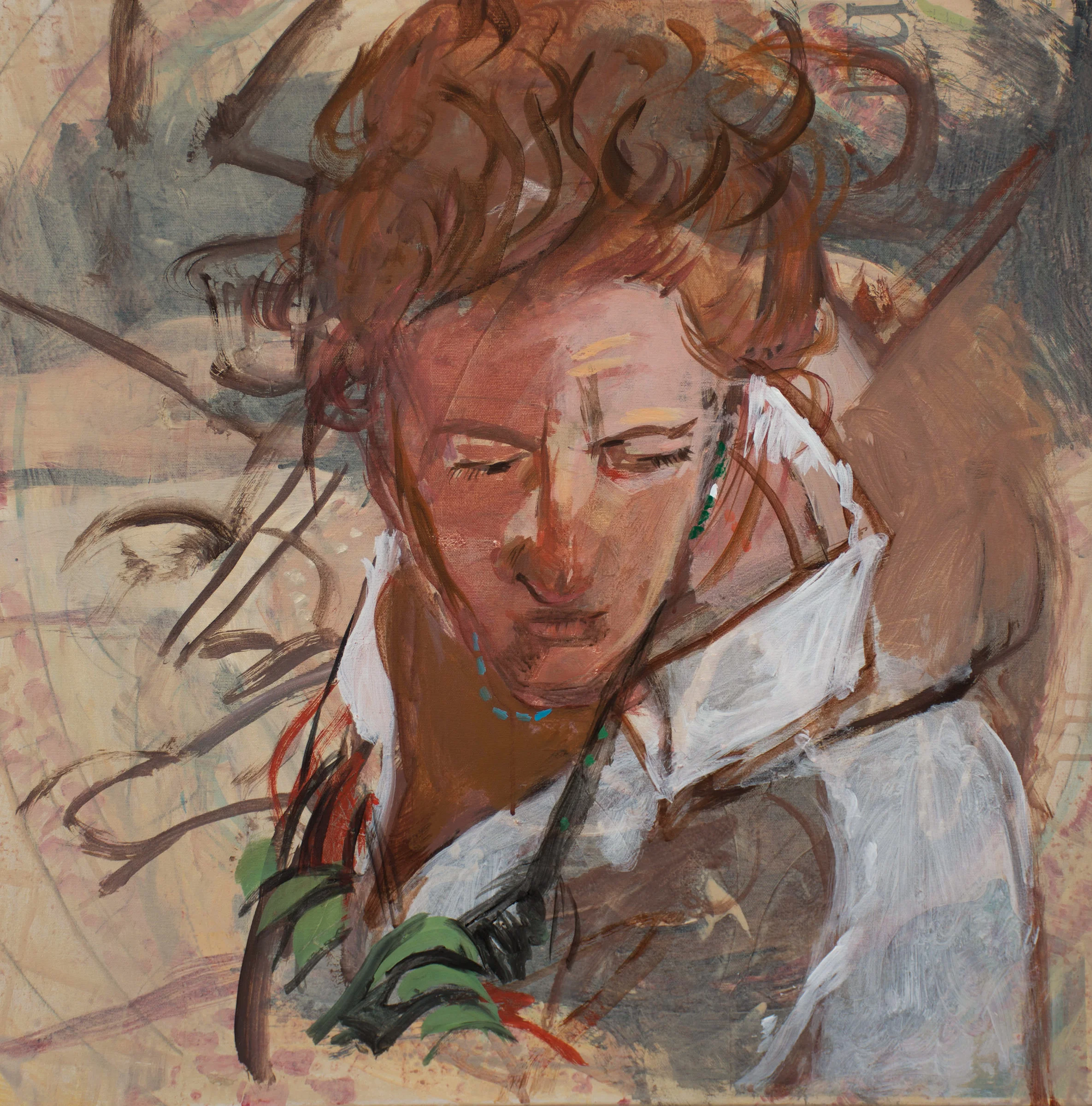2:30 PM: here's where i'm stopping for the day; i have to be somewhere at 3:30. this totally unexpected painting, which i'm calling gaze 27, is based on a photograph i took with my phone last year at a dinner party. tamar is an excellent chef, and she was cooking when i shot this from above. she has this amazing red hair, and the way it was falling over her ears is a painter's dream. in it's current state, this painting evokes giacometti portraits with a dose of manet & a sprinkling of freud. of course, it's all tarlow, but tarlow is all these things.