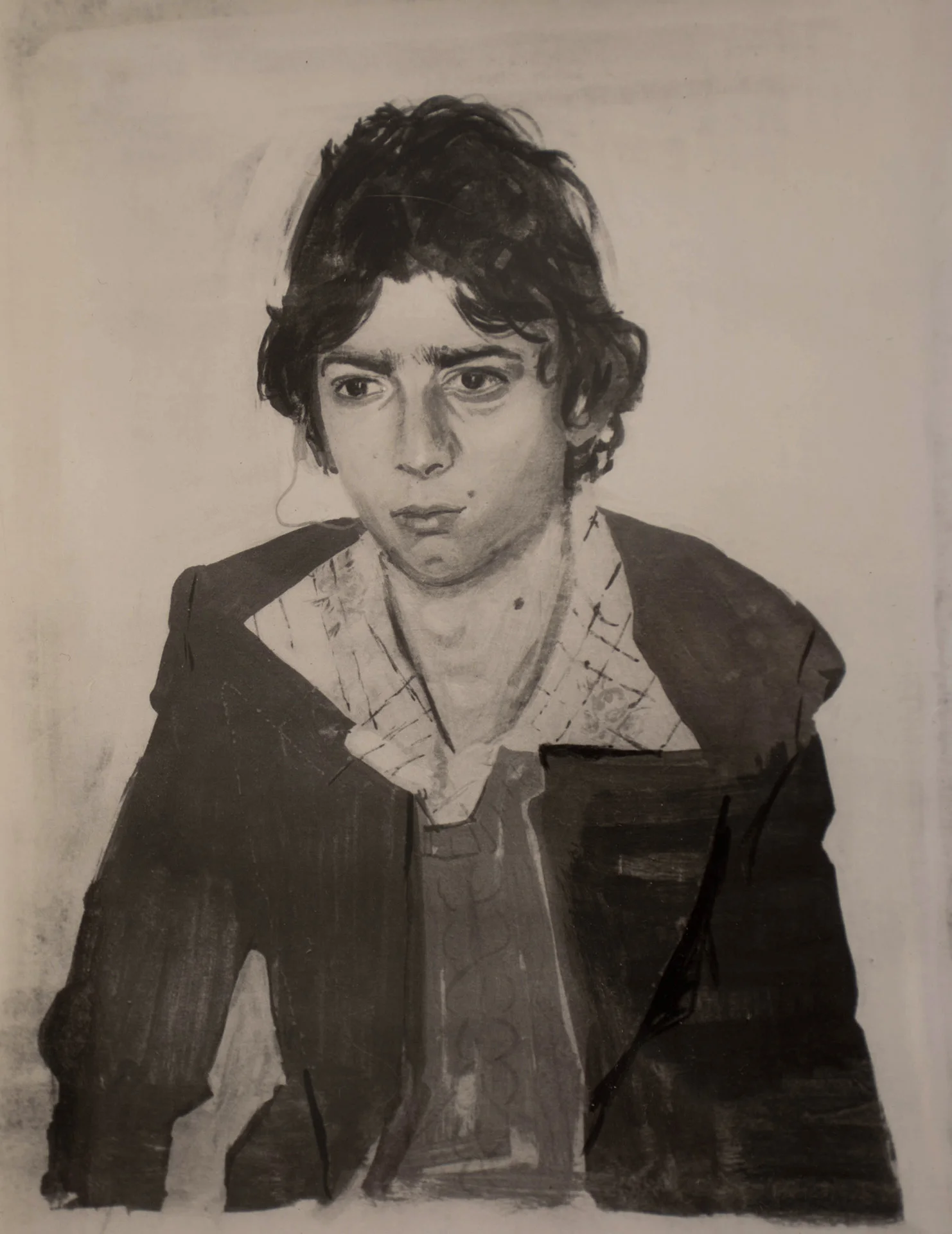 looking back: black & white photo of a portrait of a boy with a hearing aid, painted in andros, greece in egg tempera on board, about 1978. his eyes tell the story.