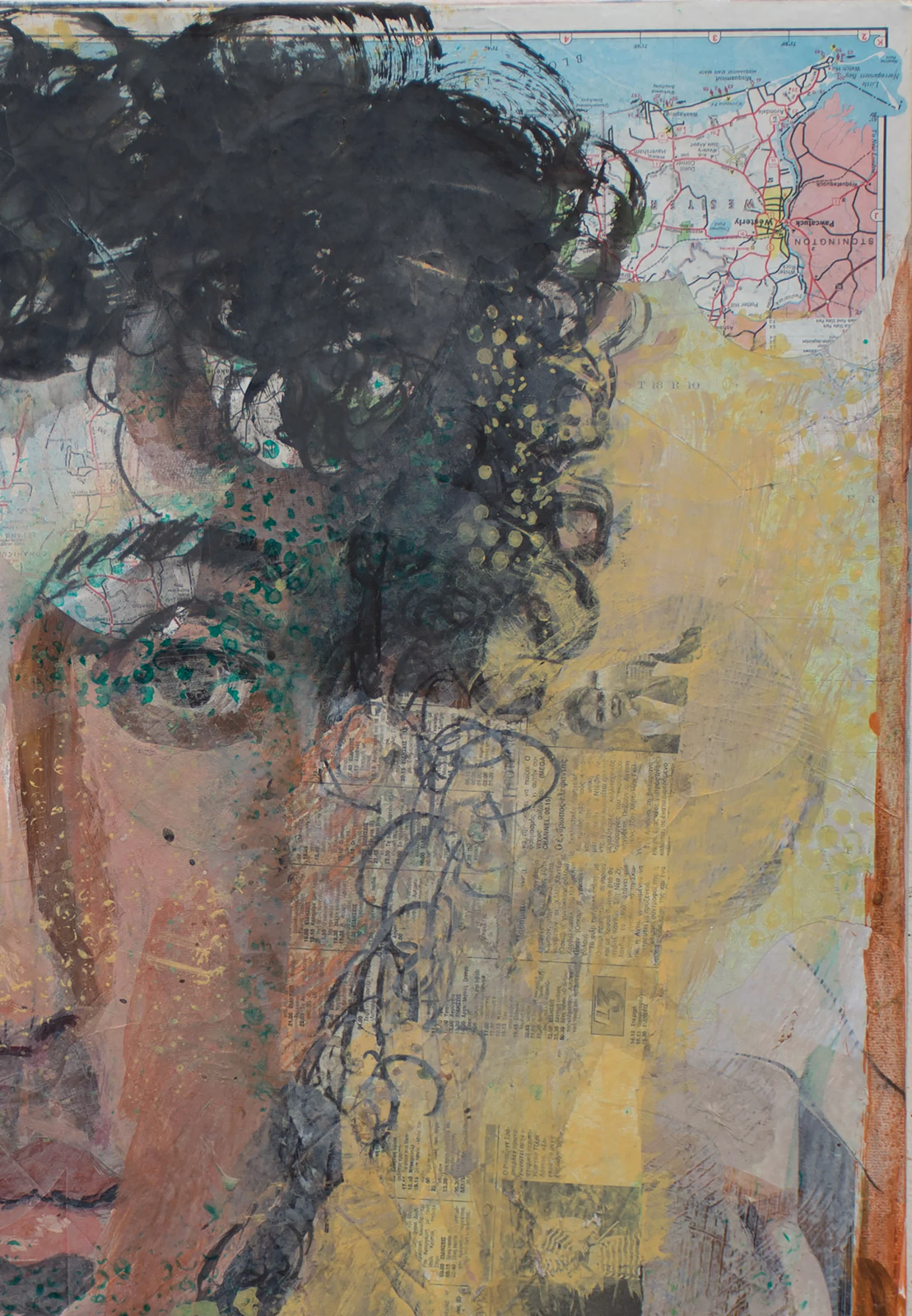 1:23 PM: sexiness trumps all: introducing a few collaged elements juiced up the picture surface. examples: the blue and pink of the map on the upper right; the colored dots, especially the green ones in the lower quadrant....(see detail below) ...these elements add incalculably to that quality translating to increased liveliness, playfulness, pure visual desert-like qualities that make looking at the painting an ongoing adventure.