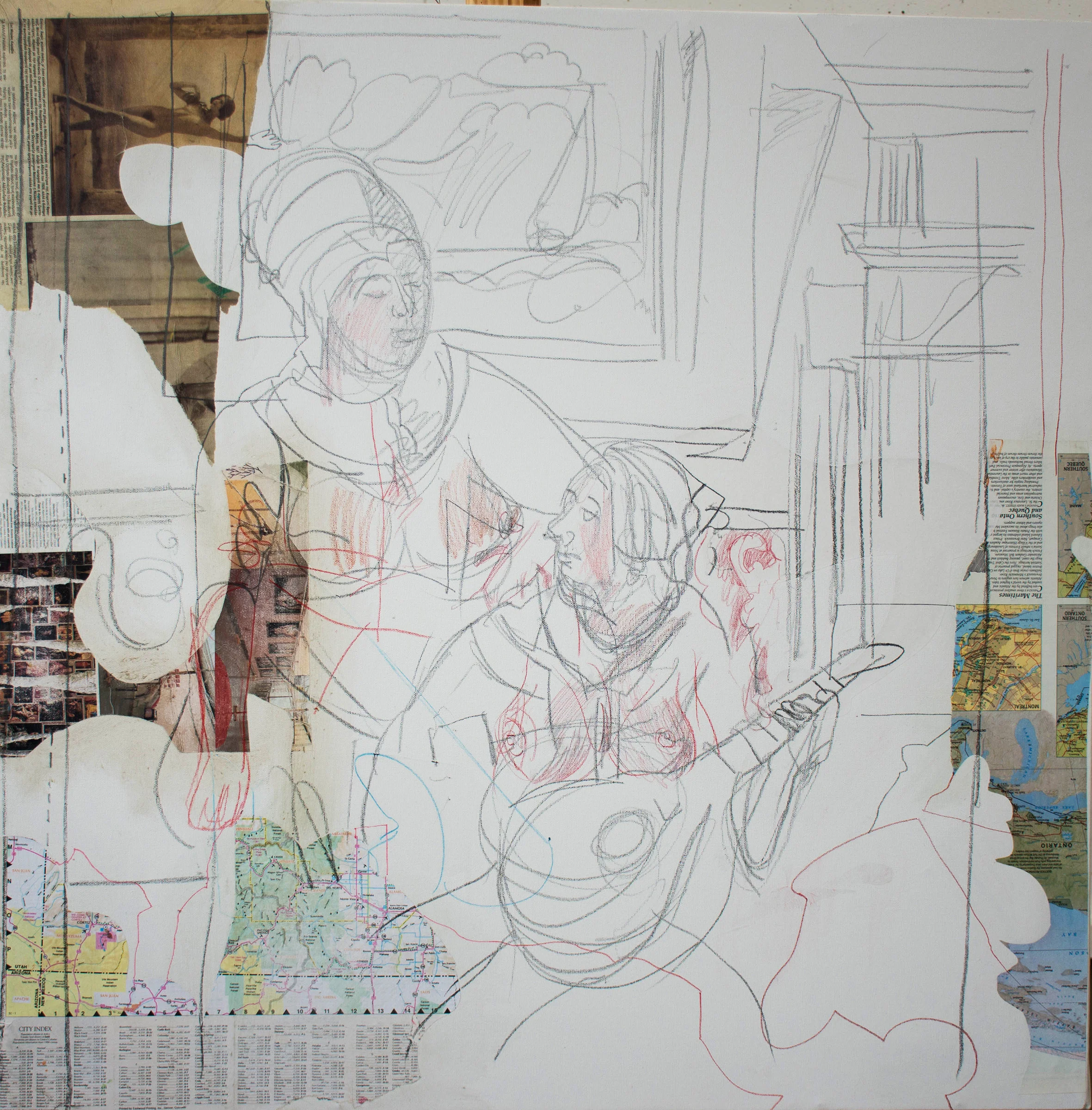 2:25 PM: stage 1 of gaze 28; about to start drawing...on the right, a detail of the upper left quadrant, with a newspaper clipping of a photography by nellie, of the dancer mona païva, of the comedie francias, dancing nude at the acropolis in athens.