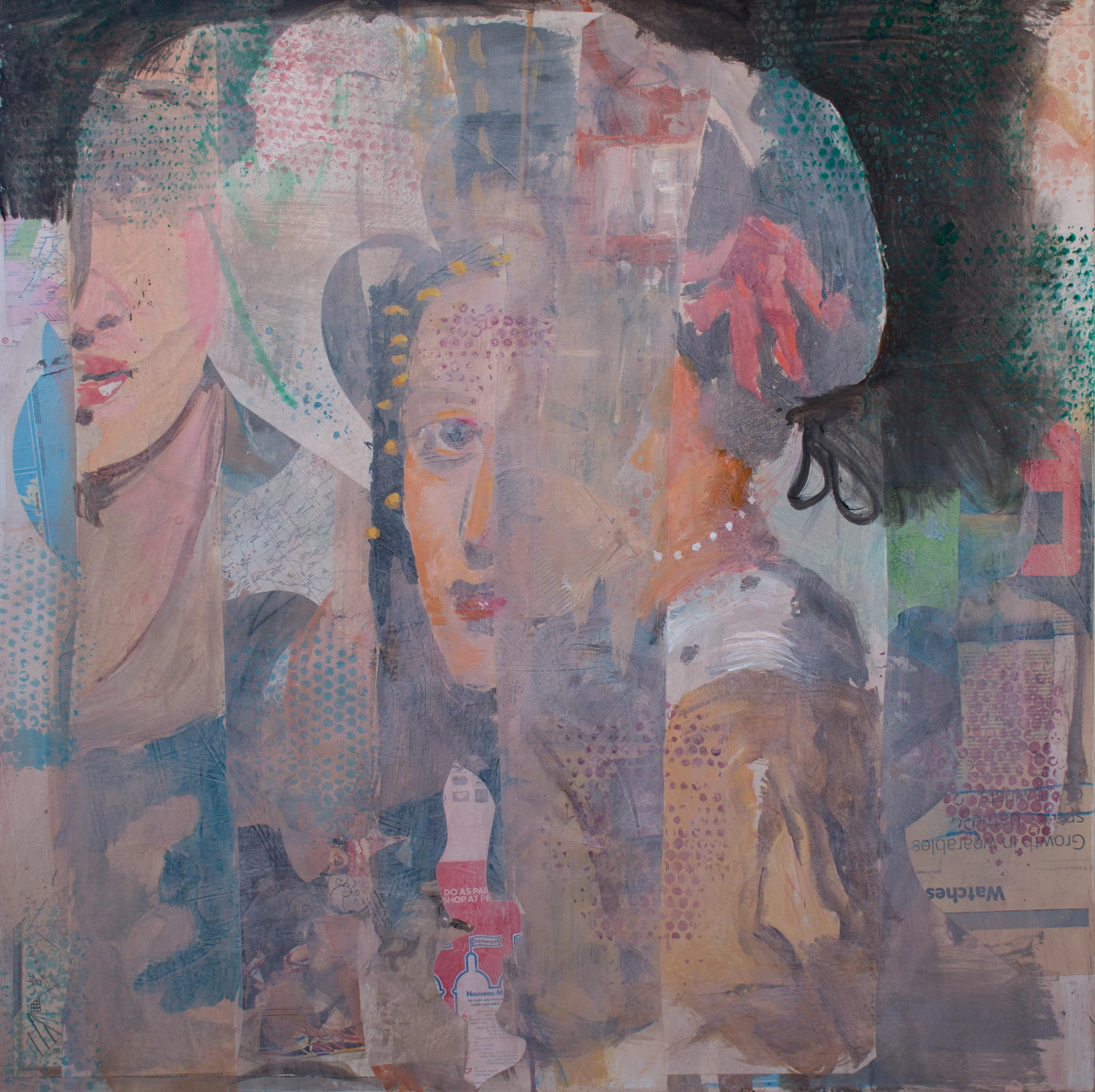 8:49AM: today i need to stop work a little before 3 to get to an appointment. my plan is to continue work on gaze 28. after looking at gaze 23 for a few weeks, it just doesn't cut it, so i'm bringing it back to the studio, where i'll re-stretch over masonite & go back into it. the idea of multiple faces was interesting, but is a good example of something more mental than tactile. i don't want my paintings to make you think before feeling. the initial glance tells the story. i want the viewer to be smitten at first glance, like when you see someone across the room & their gaze instantly attracts you. the why comes later. this is gaze 23 as it looks now.