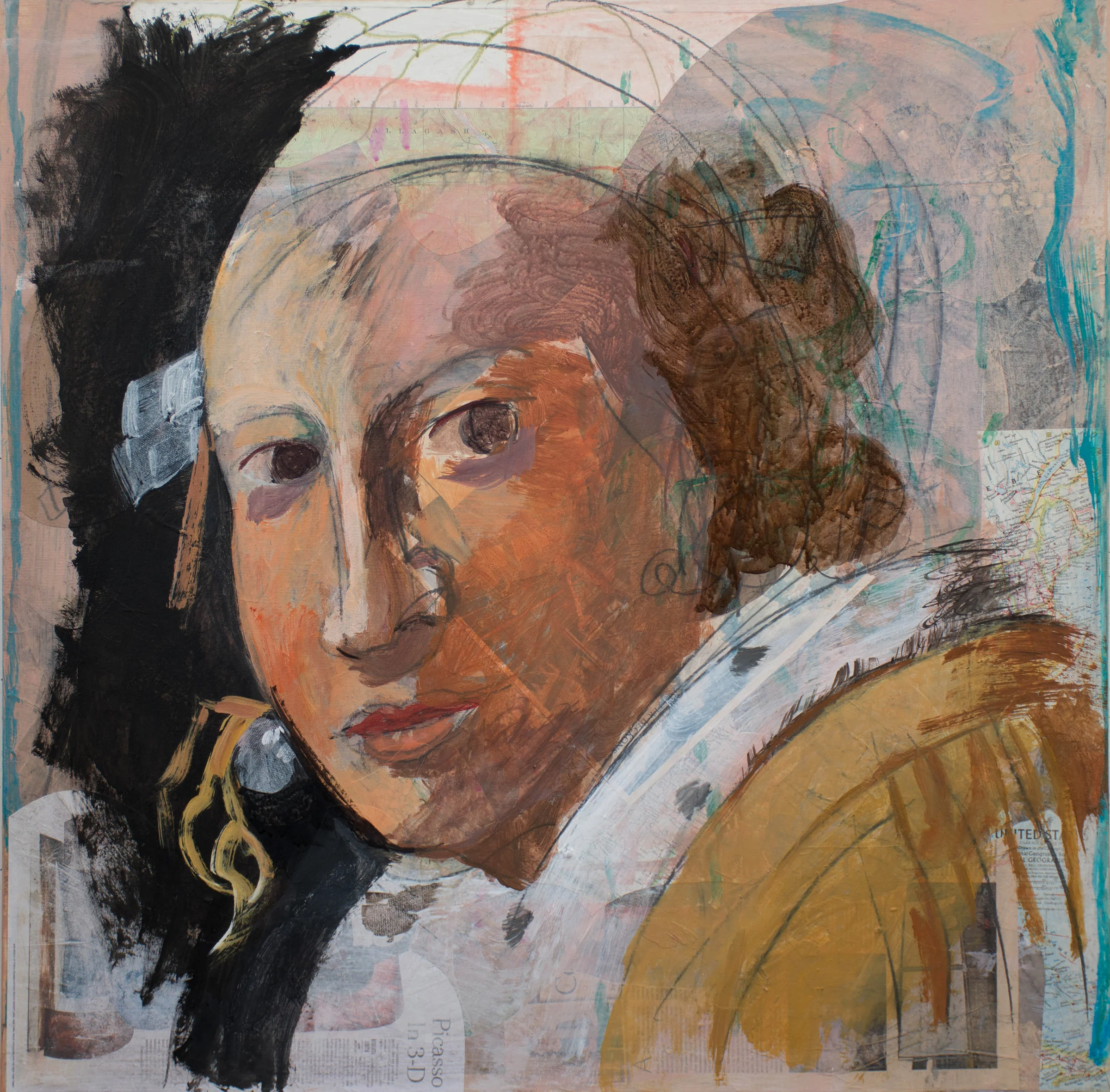 2:03 PM: gaze 27 is now a second variation on vermeer's lady writing a letter, the first being gaze 16 (formerly grey 16) i'll continue work on this tomorrow after our 5 am trail walk. it will undoubtedly soften, but i'm feeling good about the direction it's heading. the collaging i did earlier today prepared the ground for her, as did a series of calligraphic strokes i made on the canvas before collaging, a few of which can still be seen, such as the faint blue marks on the upper right. i had to wait to receive more of my favorite black, which is far superior to any of the other blacks i have, and is made by sennelier. got to stop early for a meeting.