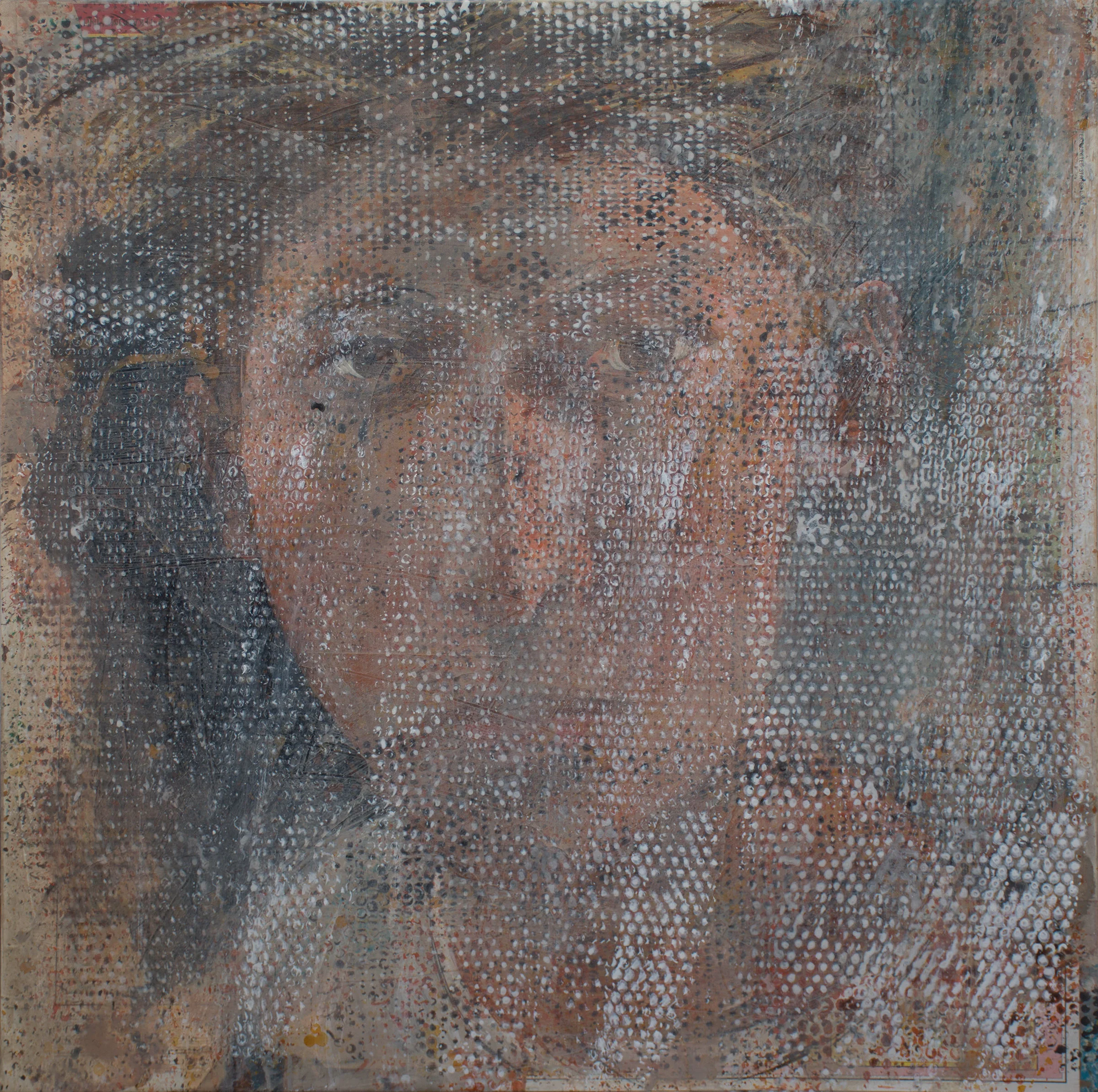 i worked on there 3 paintings, moving from one to the other like a dancer. i have to go out in a little while, so this may be it for today. from top to bottom, BELOW: gaze 21 (manio); gaze 23; and gaze 28 (philip) all 3 have been filled with colored dots in a manner that might suggest pixilation; tack on whatever meaning you like, but, as always, the integrity of the picture plane plus that x-factor are what count. as with all paintings, they must be seen in person to know if they work or not.