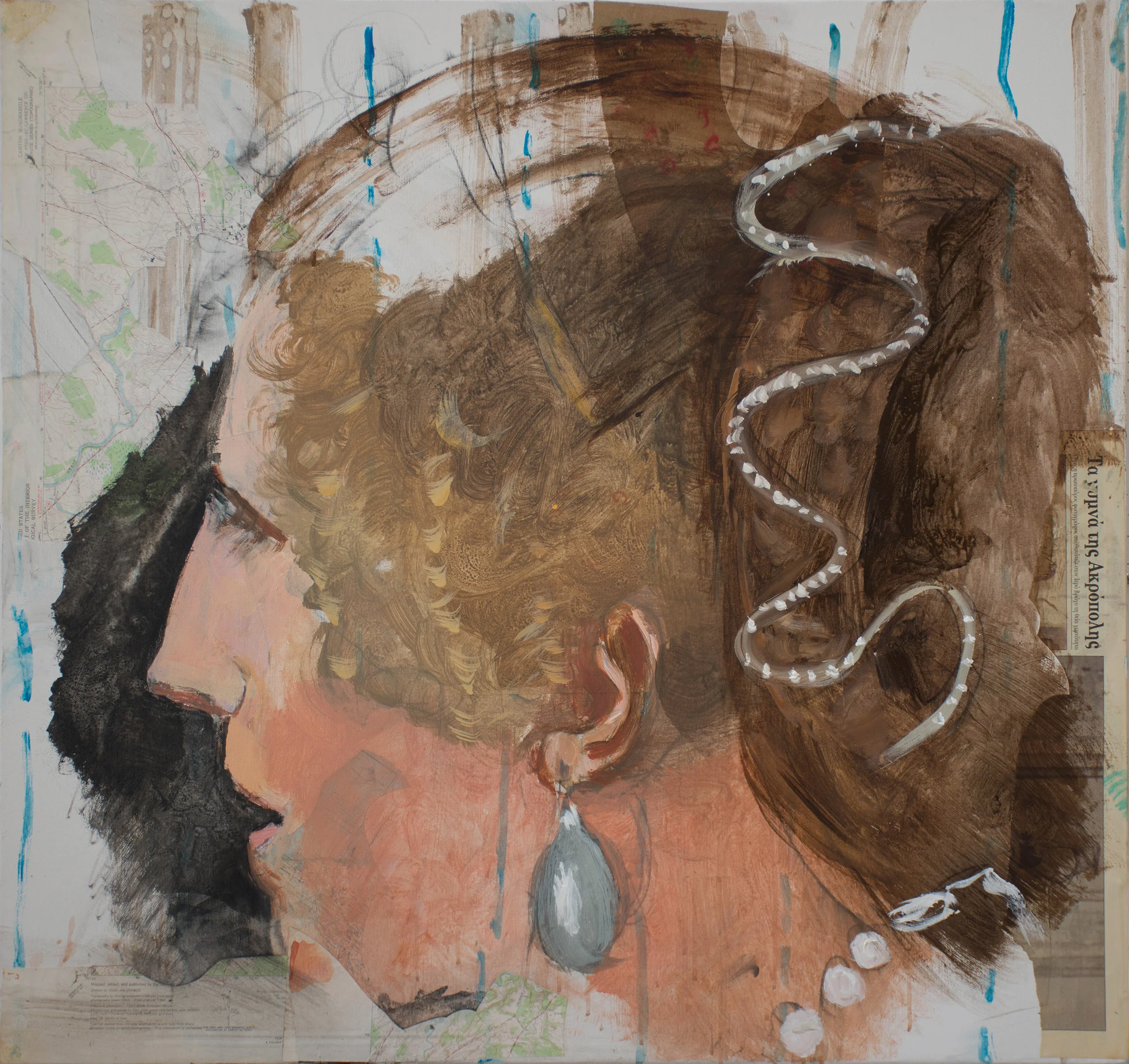 1:34 PM: i'm moving ahead slowly with this one. today i worked on her hair and the beautiful clip holding her bun in place. the collaged elements and the patterned blue and grey vertical stripes i made on the canvas, after completing my preliminary drawing in graphite, are for me an essential element in the delicate balance of the picture plane. i'm not completely happy with her ear, which i'll do some work on tomorrow. overall, there is, in person, a fragile balance right now, and the vintage '40's map of maine, given to me by by friend dan, plays as much of a role as any of the details of her face. i am changing up the context, bringing vermeer into the territory of graffiti and weather worn outdoor advertisements, as much as the faded frescos of pompeii. there is something airy, and it has a bit of the flavor of a preliminary sketch, executed rapidly and with the certainty that comes from a lifetime of drawing.....except for that damn ear!