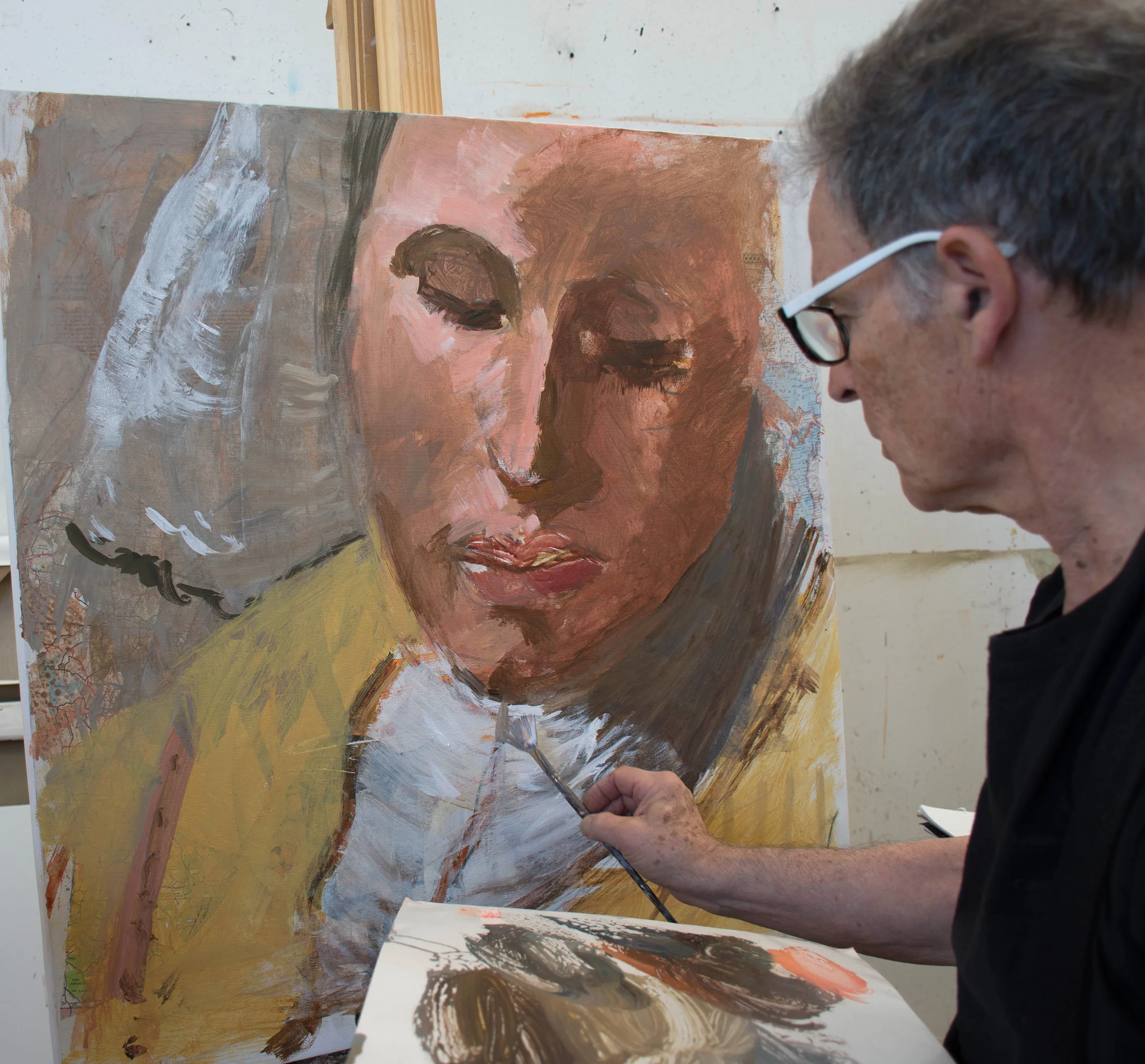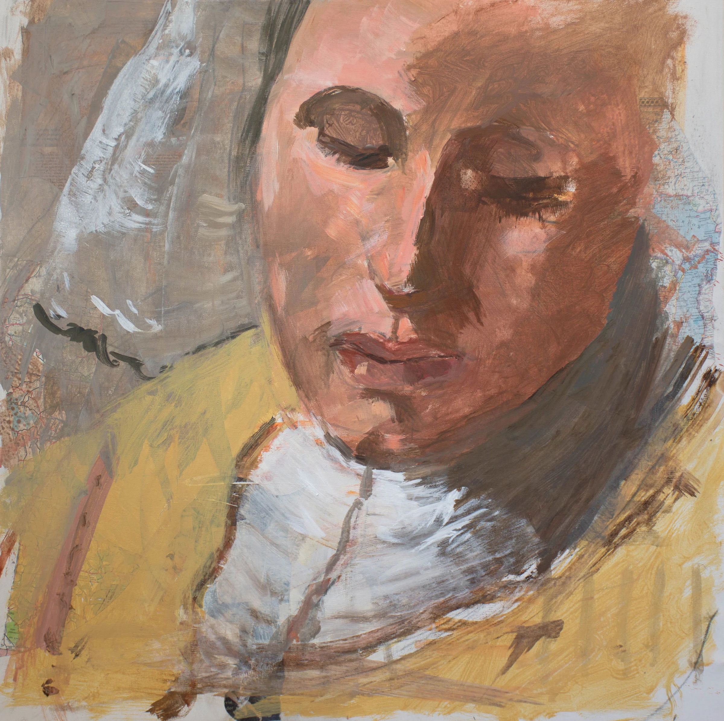 as in so many other vermeer paintings, she faces a window, which casts a strong, beautiful light on her face & body. the original hangs in the rijksmuseum in amsterdam and measures 1.45.5x41 cm. the tones are warm, which is reflected in gaze 32. our inability to see what's she's up to creates a mysterious air; she looks contemplative...almost meditative. the paint is applied boldly. hals came to mind as i was working. not sure where i'll go from here. it would be unusual for me not to scrumble & collage over it, but my sense is to leave it for 24 hours & let her make up her mind.