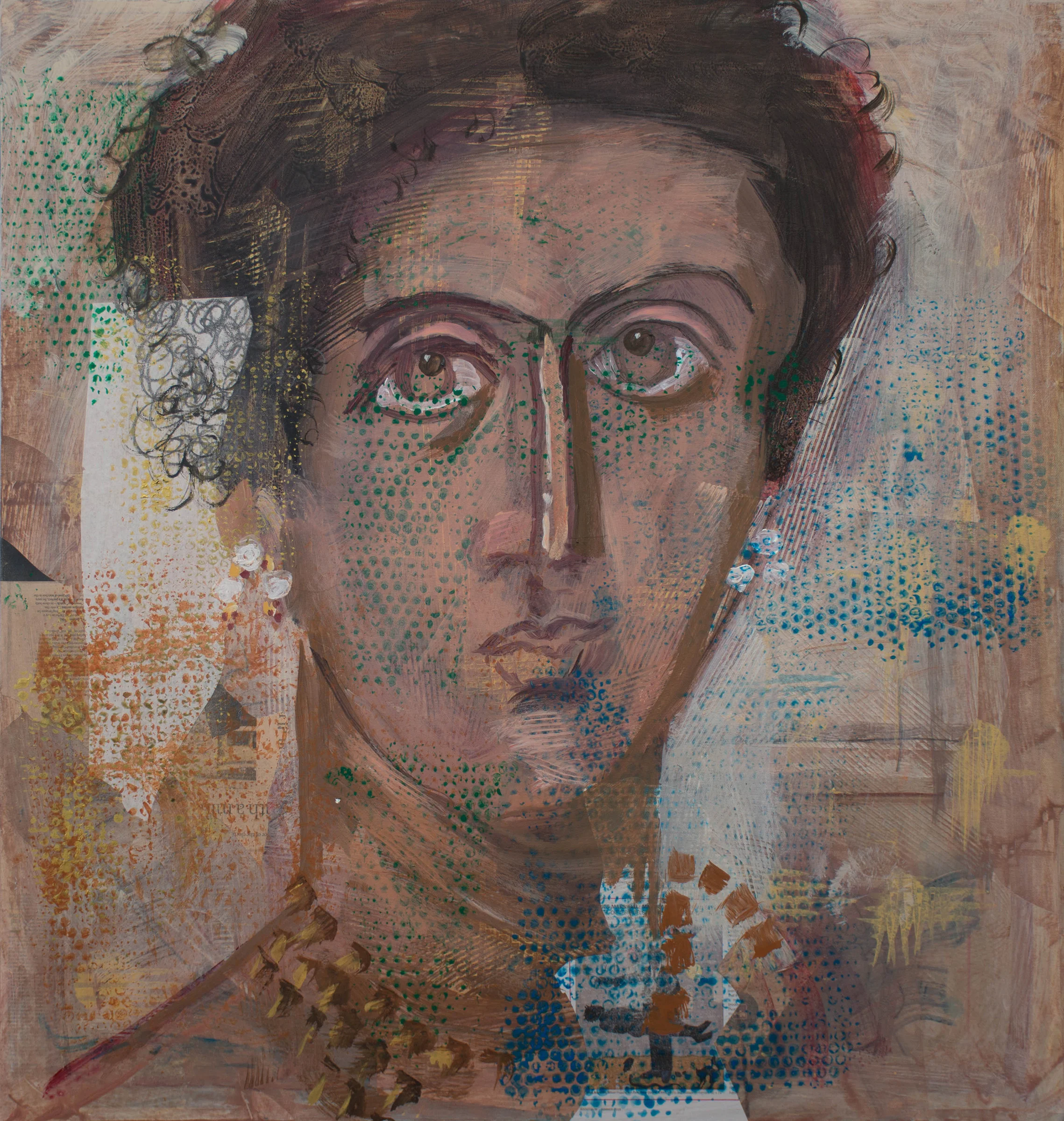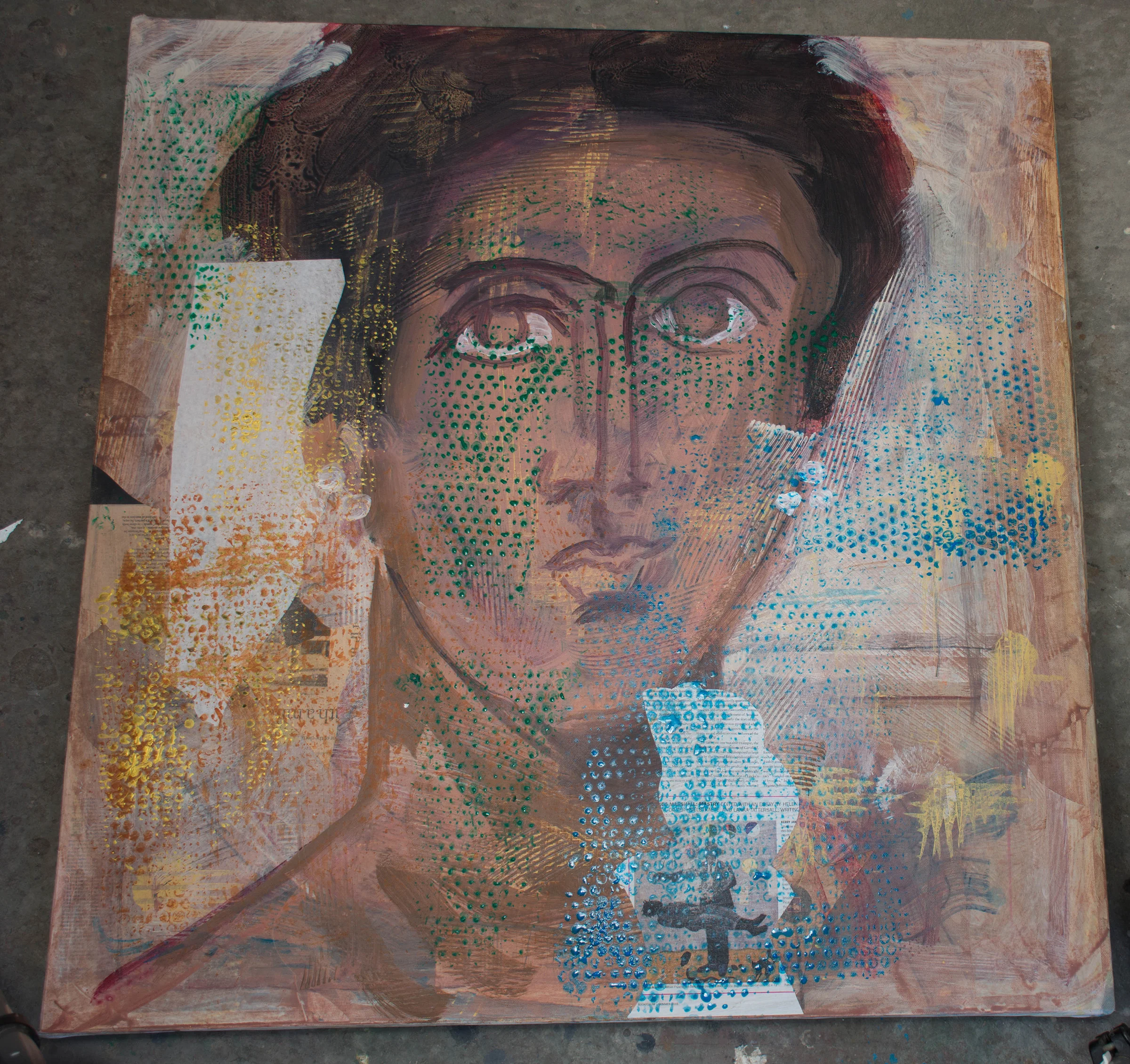 12:30 PM: my all important first gaze as i entered the studio a few hours ago let me know right away that i needed a new image. so the archeology of gaze 33 is beginning to resemble many of the earlier paintings in the series in that it is accumulating layers and layers of ancient debris, so to speak.