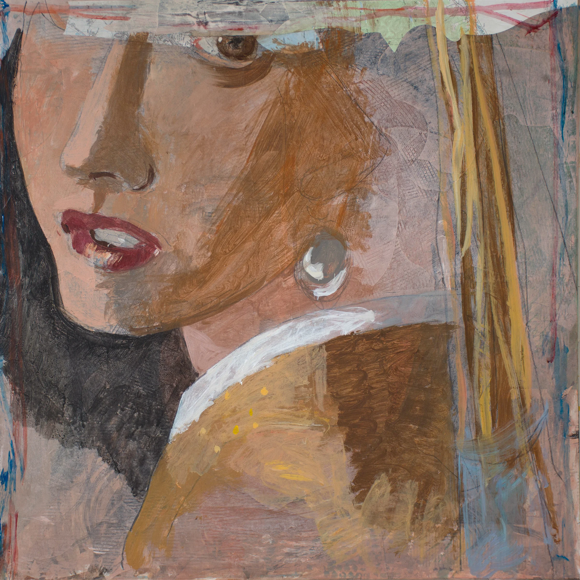1:44 PM: all roads, it seems, lead to vermeer! i grew weary of this pained native american visage and returned to the core theme of my gaze series: vermeer. the image is now based upon a detail of the girl with the pearl earring, which single handedly has brought vermeer into 21st c. awareness. remnants of the underlying image peek through mysteriously, as a ghost image.