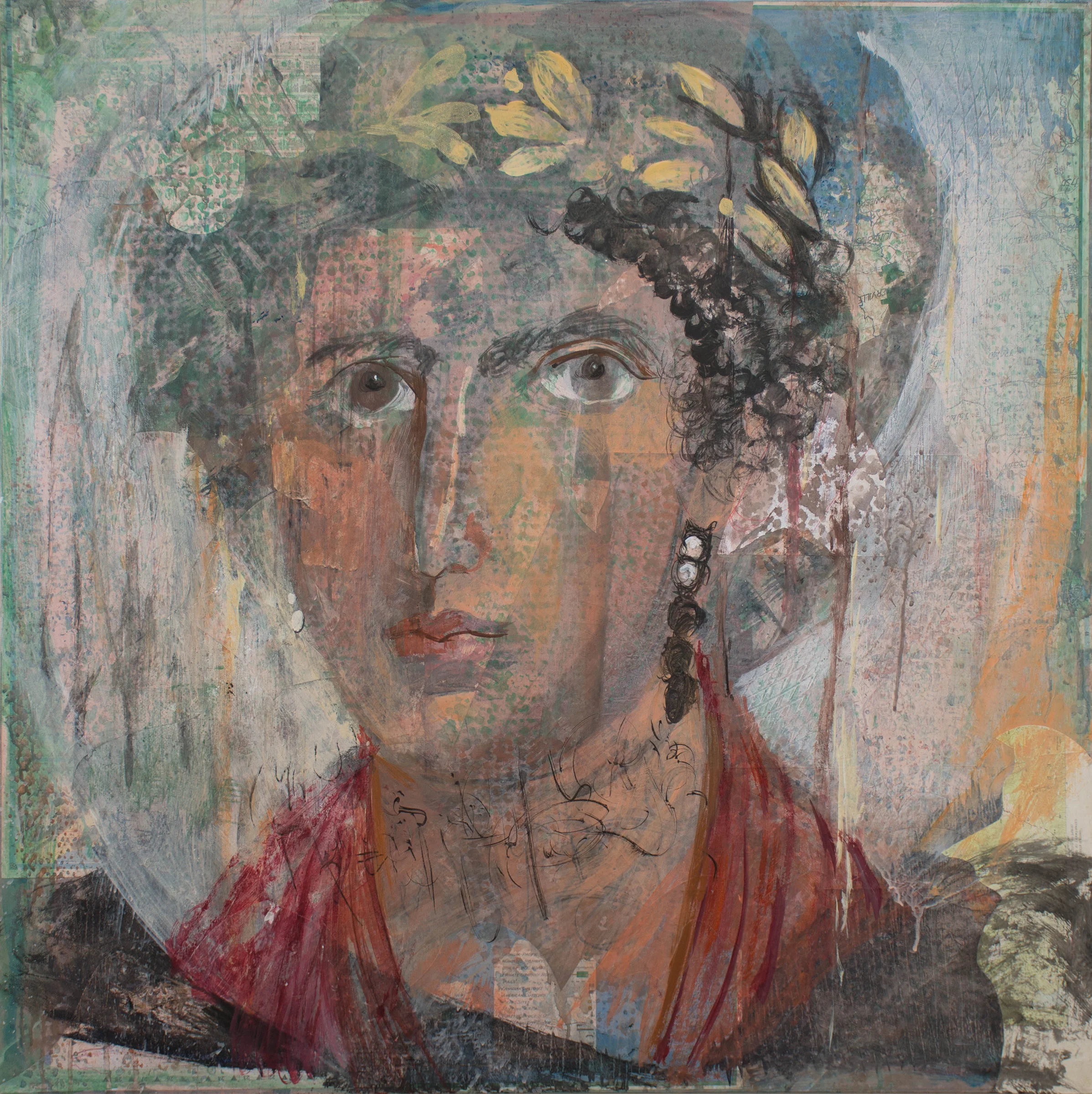 i had been critical of the grey area surrounding the face in the nov. 1st iteration. so i brought it back to the studio. the day before leaving for edwards, i brought it to the state you see above, middle. while i like what happened with the areas on either side of her face, i wasn't happy with the face itself. today, her face re-gained it's richness and fullness. at the same time, it integrated with the background in a way that allows the eye to freely wander over the painterly surface. areas of background can be appreciated in and of themselves, as can be seen in the details below. the whole surface sings when compared with the nov. 1st version, where the grey surrounding her face creates a more traditional separation between background and foreground.