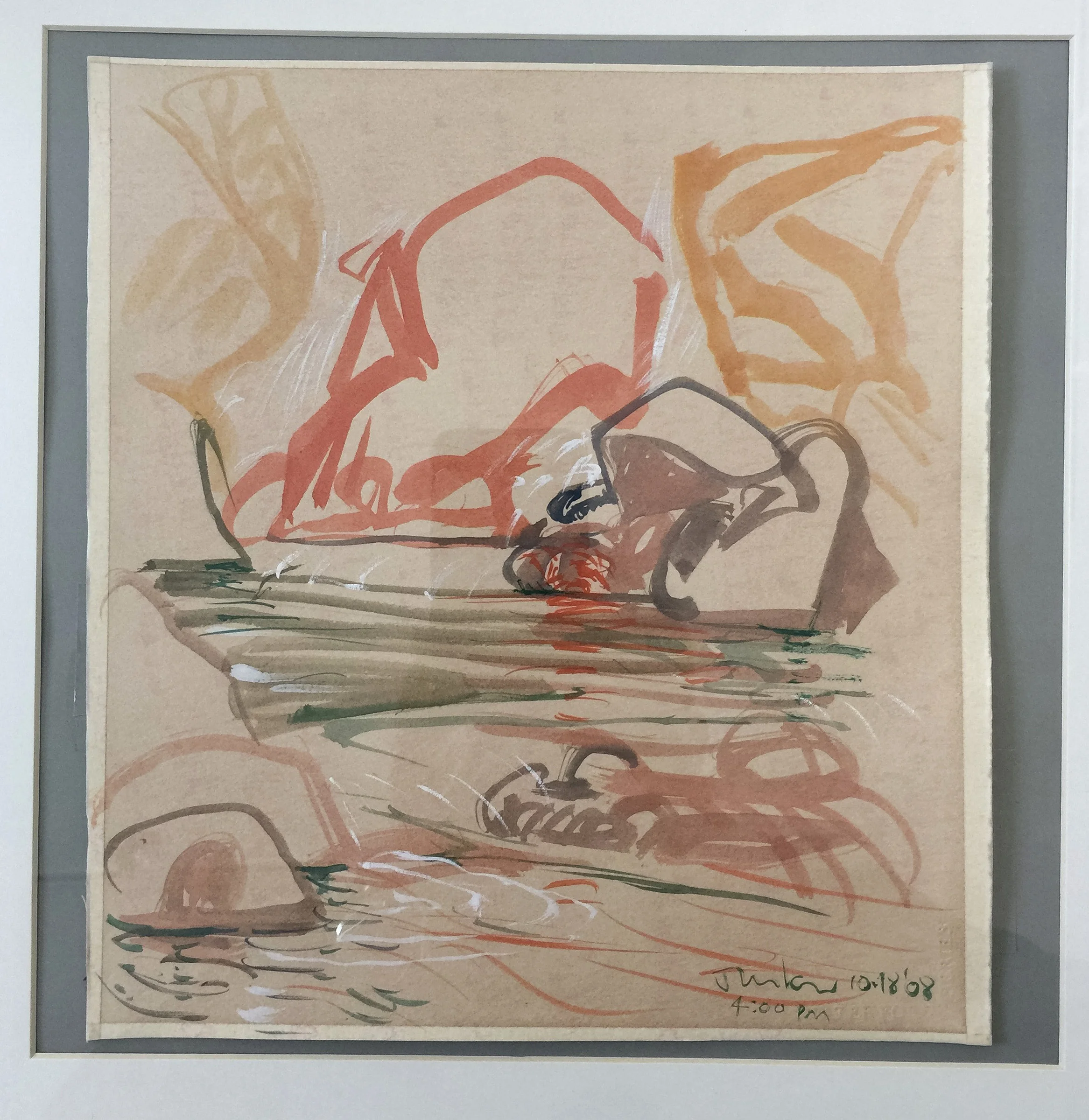 10:38 am: on august 18, 2008, i went up to a favorite spot at the creek and made this small (10.5x9.5 inches) painting in gouache on tinted paper. it was one of a series of plein air paintings i did that year. i would carry my equipment, including a collapsable chair and table, squeeze my colors and make one or more of these small paintings. there are many of them from that year.