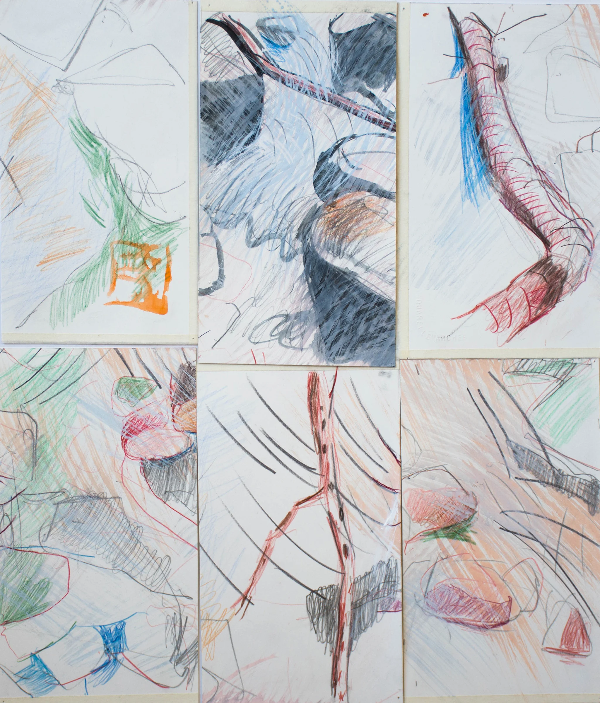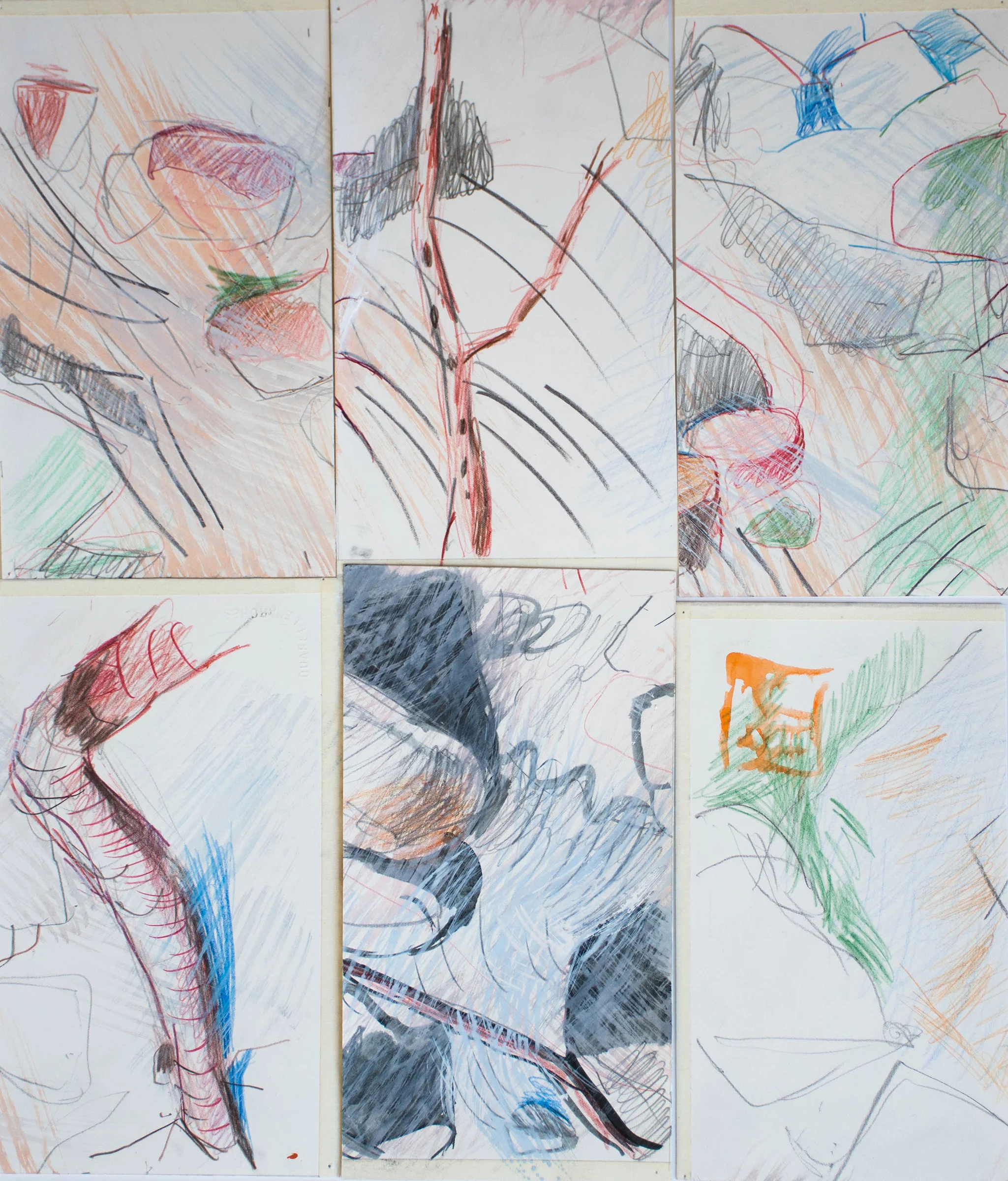 in this case, i found myself doing something relatively new. while i have in the recent past done something similar by cutting up calligraphy studies modeled after a 10th c. chinese calligrapher and then reassembling them "out of order," this is different in that i'm taking a colored pencil & gouache drawing which was already conceived as 4 discreet modules, then cutting those in half and rearranging them randomly. the word randomly is key here. unsuspected relationships occur, as with humans, when we shuffle the deck. put a random sampling of personality types together in a room for 12 hours and.....who knows? unexpected collaborations could occur. as could fights, loving relationships, and so on.