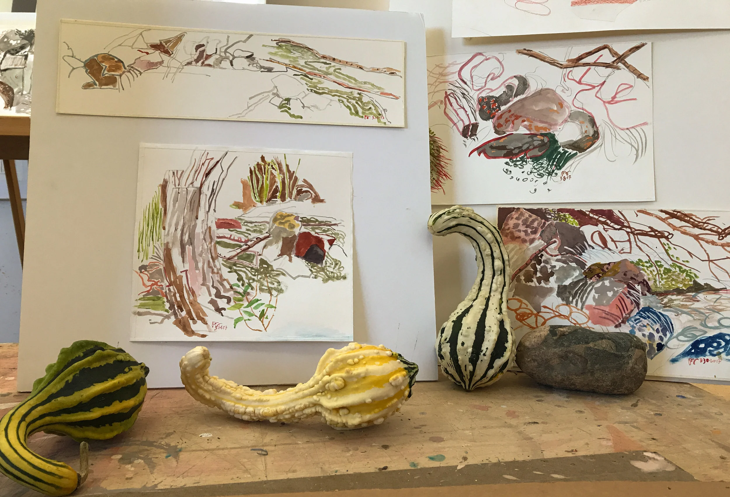 4:15 PM: i made 2 gouaches at the creek this morning. then when i returned i did more work on sweet. the squash we got yesterday from suzanne & kent have already entered the composition, which may have become a little too busy. i'll see in the morning. i do feel it's an improvement on yesterdays version. you can see the difference in the 2 images below, and draw your own conclusion.