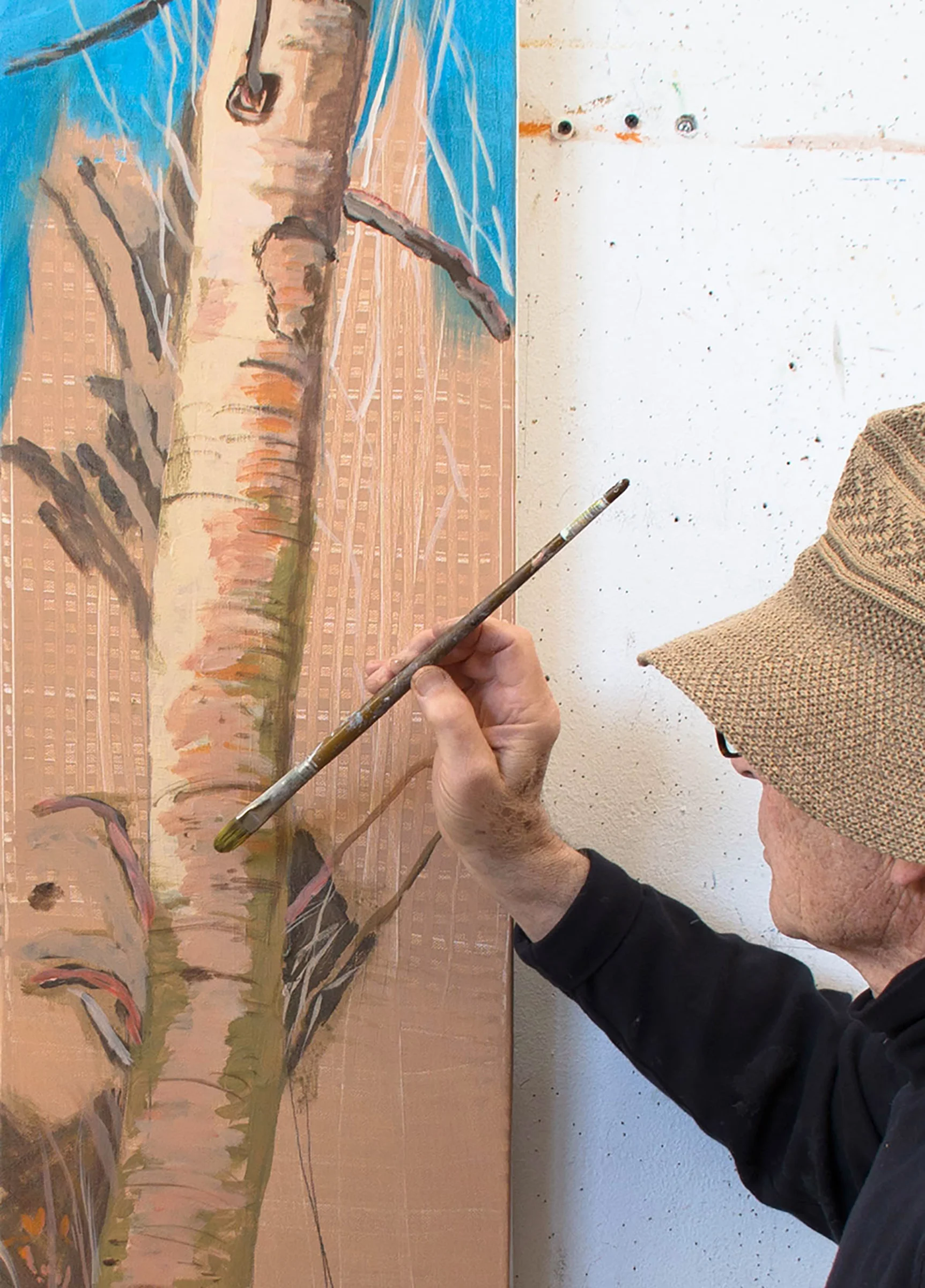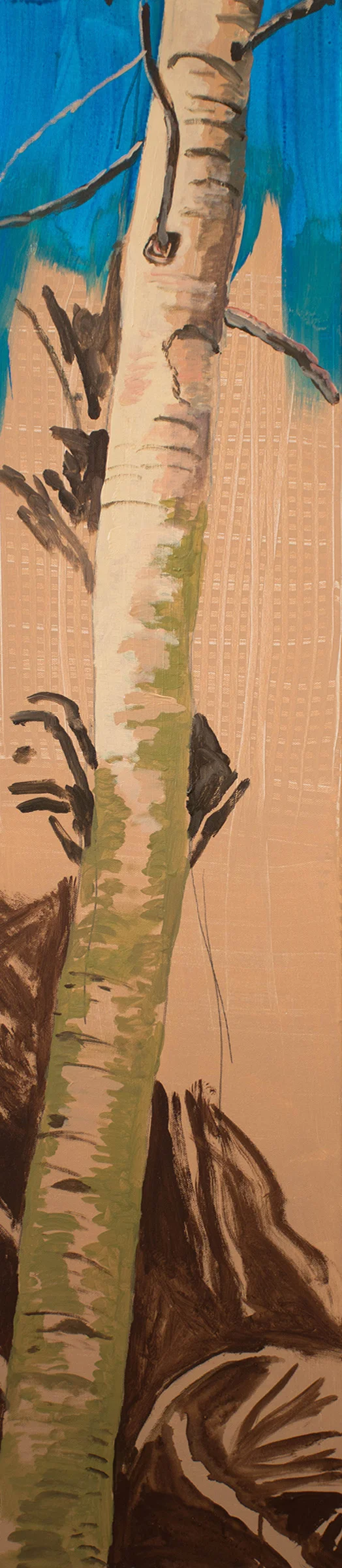 noon: BELOW is a comparative view of tree 1 this morning & just now. the blue is lighter; the browns on the bottom are lighter & broken up by twigs, branches & grasses, and the tree itself has more dimensionality and coloristic variance. if i carry out my idea of a series of aspens, they will all be tall & narrow. i've always loved this shape.