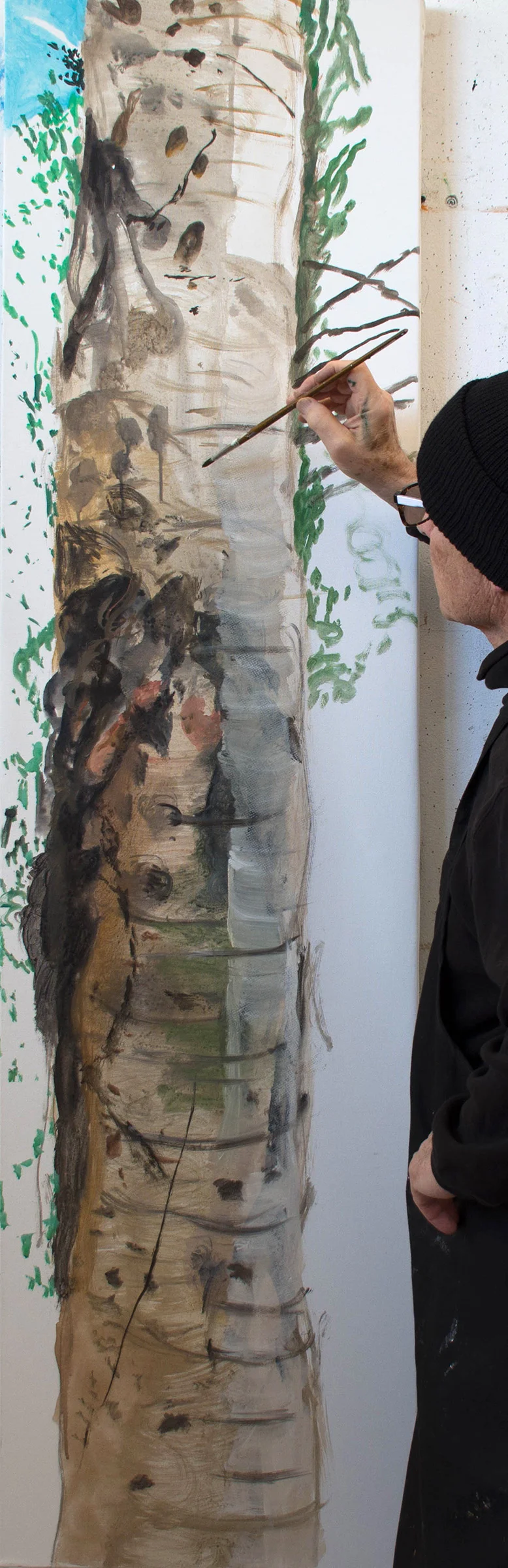 today i began work on a newly stretched canvas: tree 2, 68x18" unlike tree 1, which is painted on a siena ground, tree 2 is being painted on a white ground. so it's much more stark as an image. the fire scars on the trunk are almost painful to look at, perhaps reminding us of human disfiguration. technically, as with all my work, the foremost quality is painterliness, a gestural, calligraphic approach that is very much who i am as a visual artist and as a human, and harkens back, i sometimes think, to past lives in ancient china, where my buddies and i made music, paintings, calligraphy and poems in the wildly beautiful mountains, while drinking the local wine. a lively but dangerous time it was, with the looming possibility of falling out of favor with the latest ruler and facing possibly dire consequences; banishment or worse.