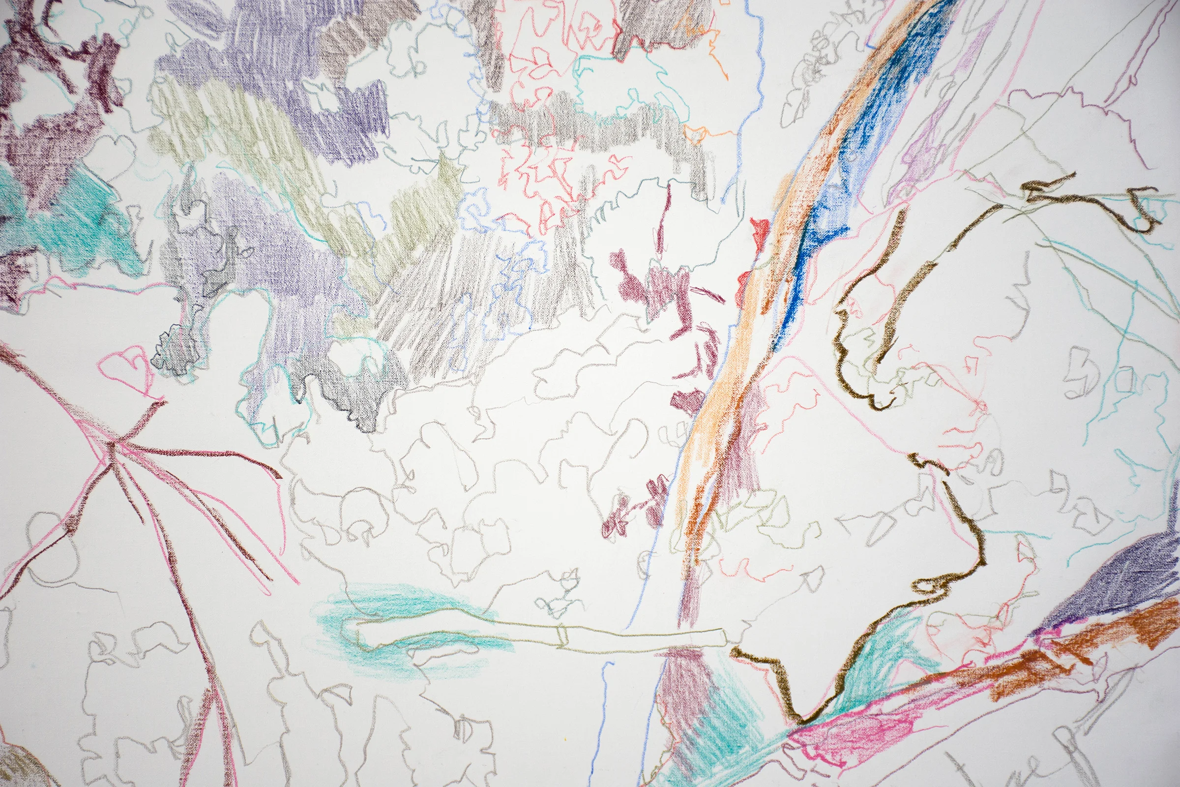 3 PM: i had a sudden wave of tiredness, so i'm stopping for the day. it looks like i'm going to stick with oil pastel, crayon, colored pencil & graphite; something i've never done before on this scale, and on portrait linen. i'll continue tomorrow, but it feels close to completion. BELOW are some details.