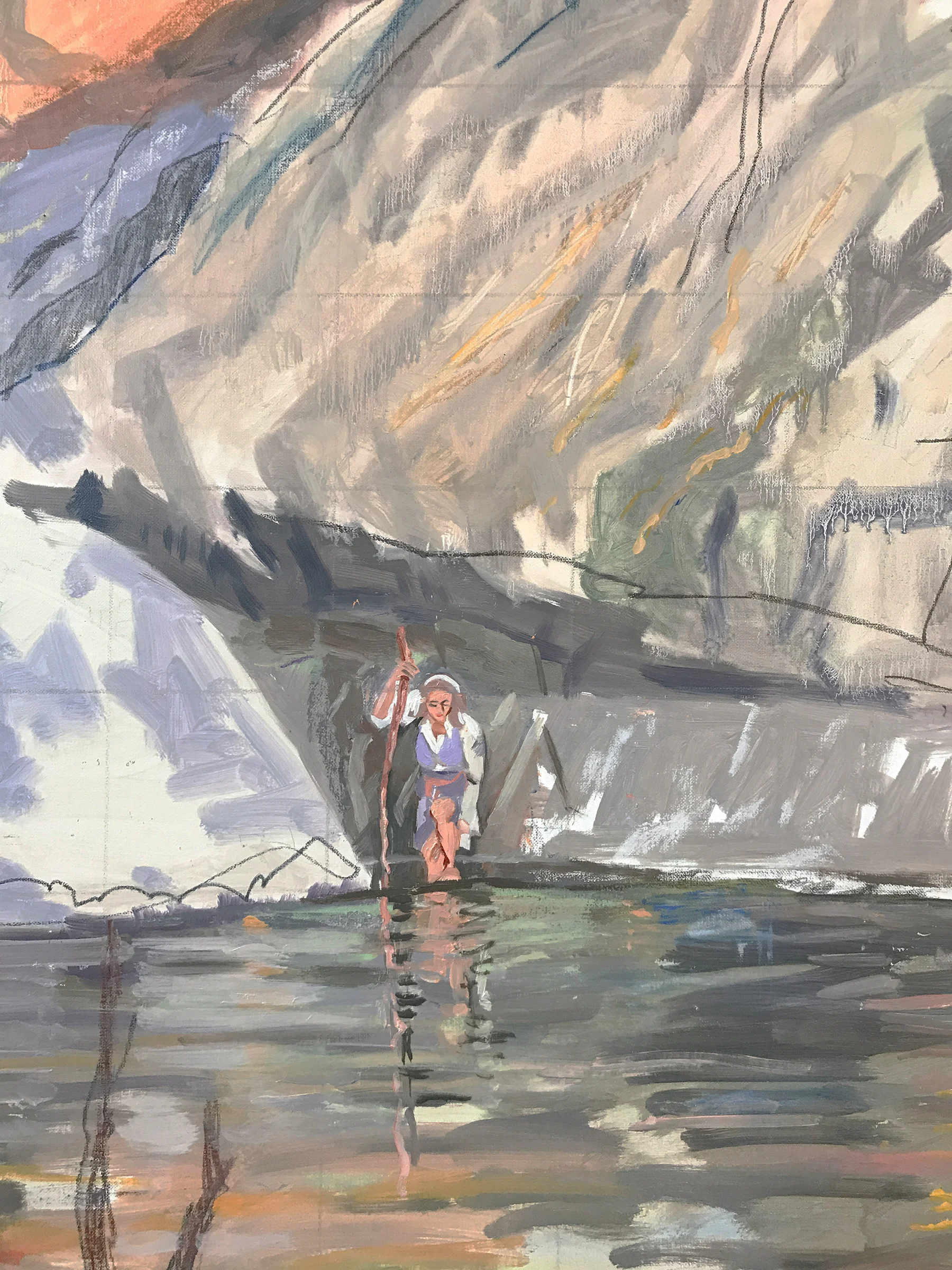 3:10 PM: after looking at woman in landscape in the house yesterday, i saw where more work was needed. i almost entirely re-painted the figure, which needed to pop more, as well as integrate more with the rock formations behind her. then i did more work on the water reflections. in both cases, i see marked improvement when i walk back 10-12 feet. the entire painting jells more . and the greater clarity of the figure adds an emotional kick. as well, i think the raison d'être for the grey gris showing through and, in the upper left, moving into abstraction, has become clear.