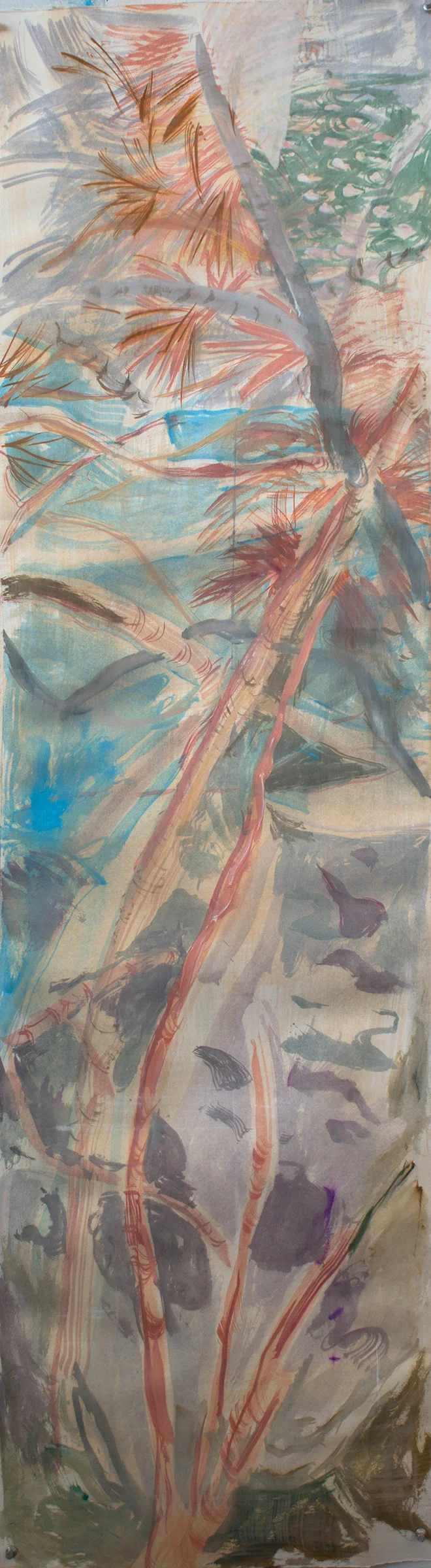 3:29 PM: as i looked at it, i found it too disjointed. probably a result of attempting to do with gouache on heavy paper what i had been doing on delicate japanese paper, which requires a lighter touch. so i went over the entire surface with a light wash of acrylic white mixed with flesh color. that's a tricky thing to do over gouache, since the brush will inevitably pick up some of the underlying color and, potentially, create a mess.