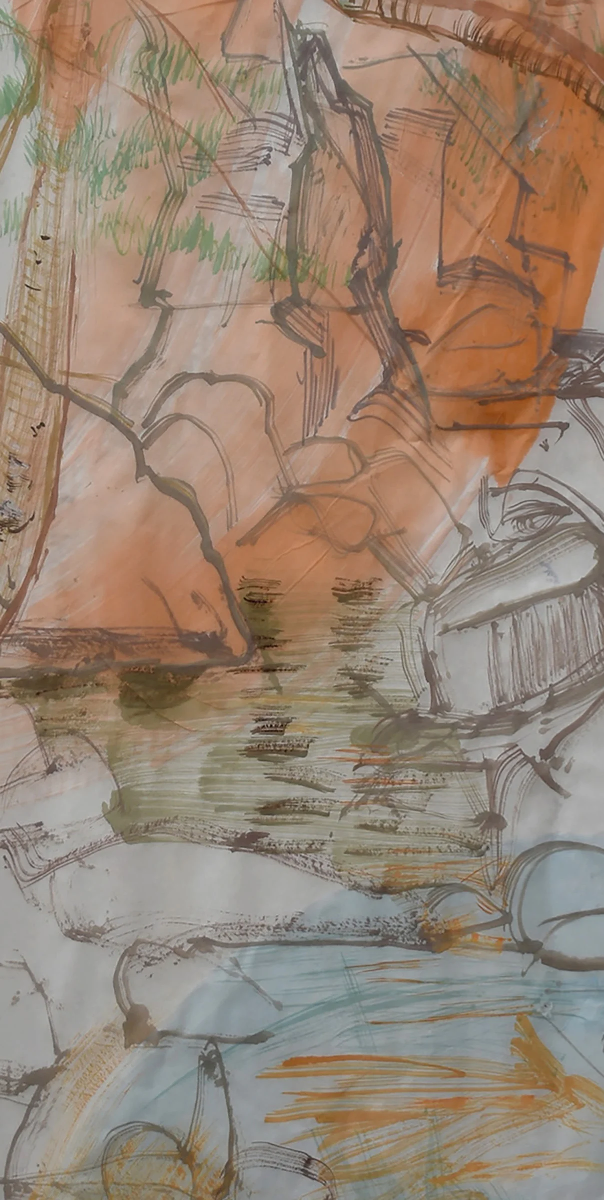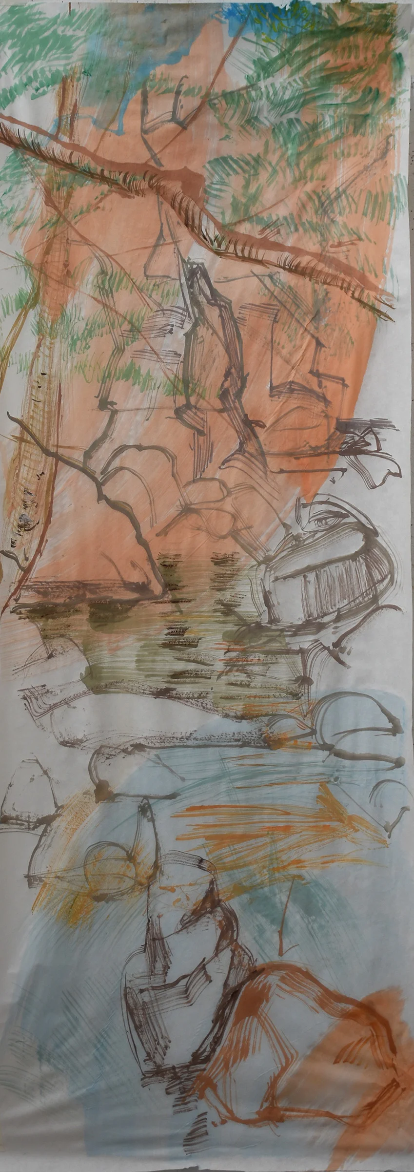 2:44 PM: this morning we were at the charter school working with the kids. so i arrived at the studio relatively late, at around 2 pm. I felt, when i revisited it, that 2-26-17 creek scroll needed something to unite the upper and lower areas. BELOW is a comparative view of how it looked before and after.