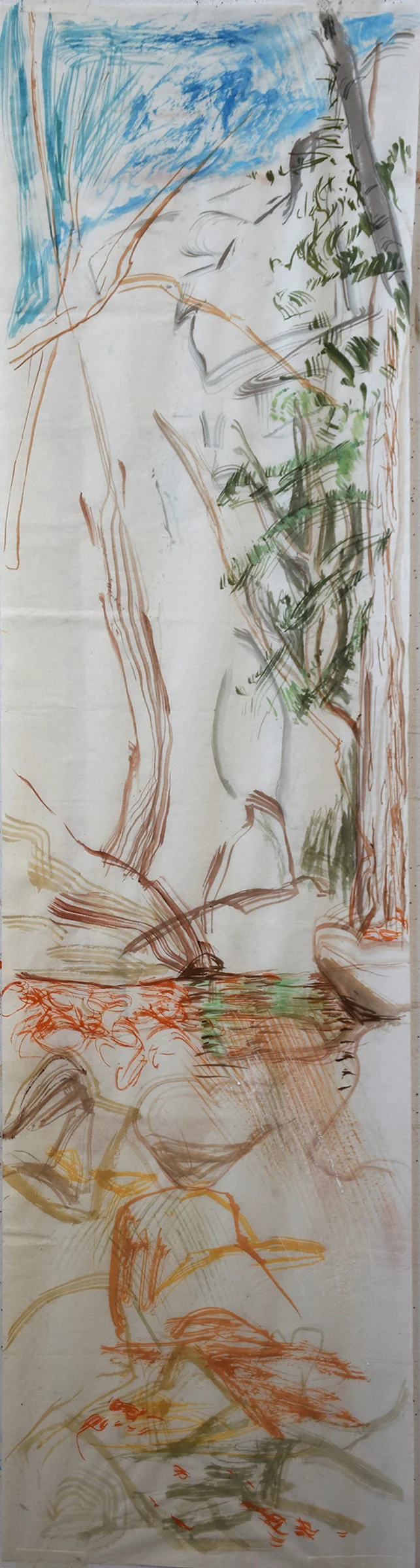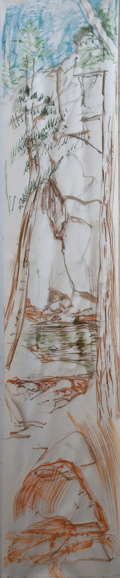 mikela walked over a while ago & reminded me that i have a bunch of narrow strips of canvas, which are remnants from pieces i had cut for specific size stretcher bars. they're perfect for the experiments i want to do in oil on canvas. i want to see if i can find a middle ground between these more calligraphic paintings on paper and the landscape oils i made in the past, many of which have the thicker aplication of paint characteristic of oil. that would also allow me to use the tinted ground i learned about in greece; a beige colored overall color that allows, for example, the whites of the rushing water to pop and gives an overall tone to the painting that brings to mind byzantine prototypes.