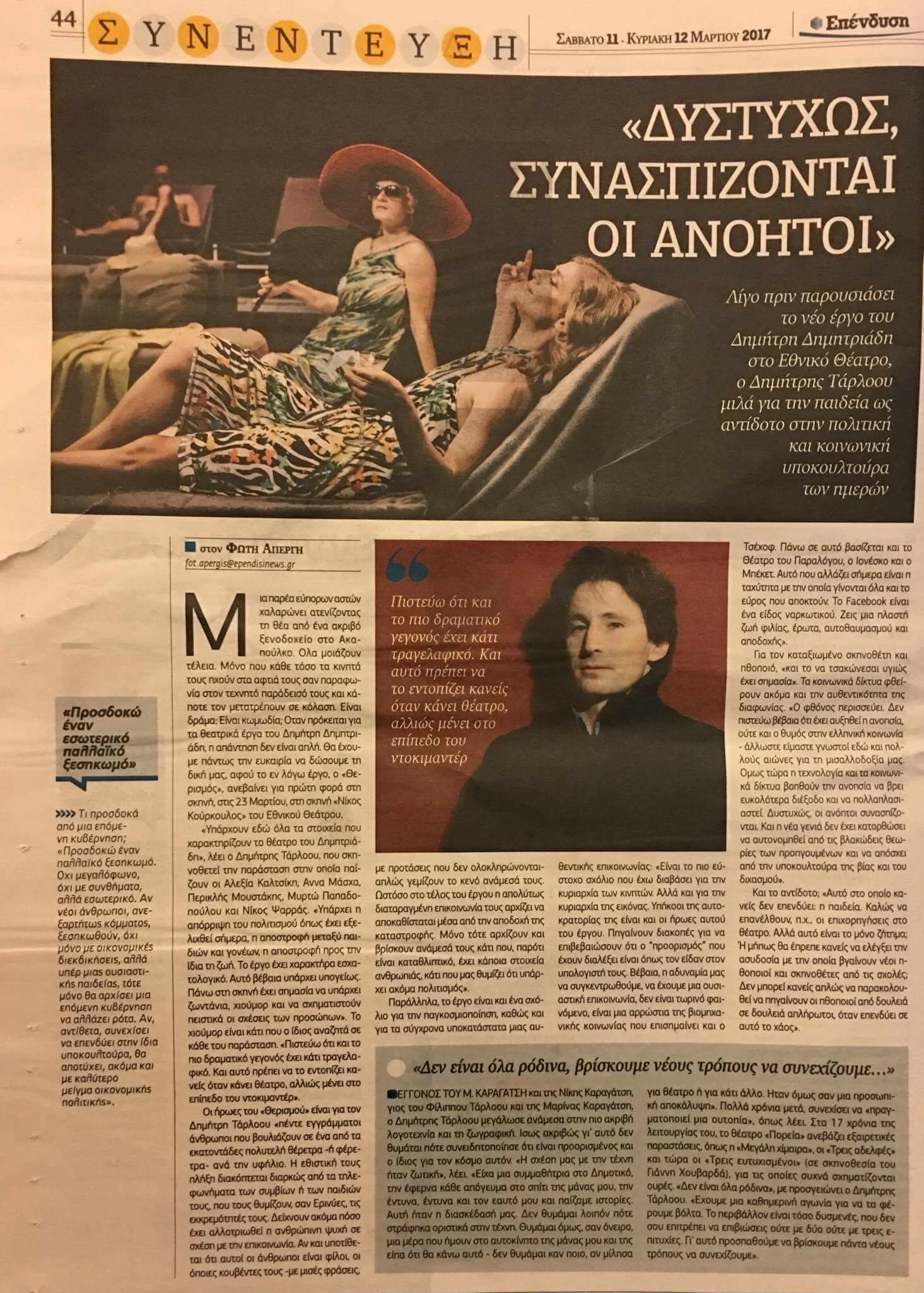 a facebook friend sent me this interview with my son dimitri, which appeared today in the magazine: ependisi. if i have time, i'll translate some of it for you. he speaks about his experiences as director at his athens theatre, poreia. currently, he's just completed directing a play due to open at the national theatre of greece on march 23rd.